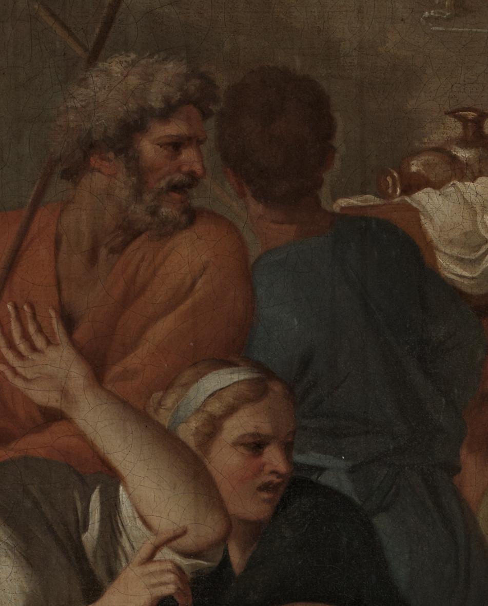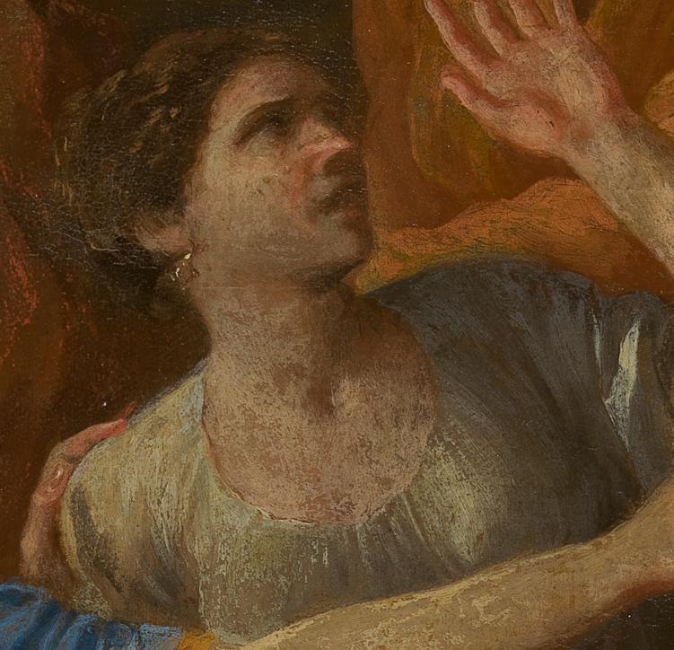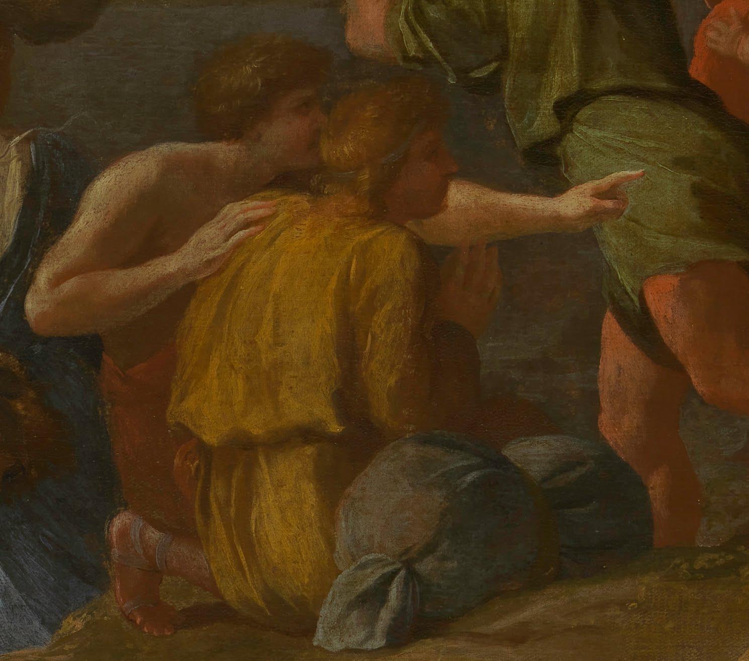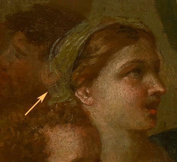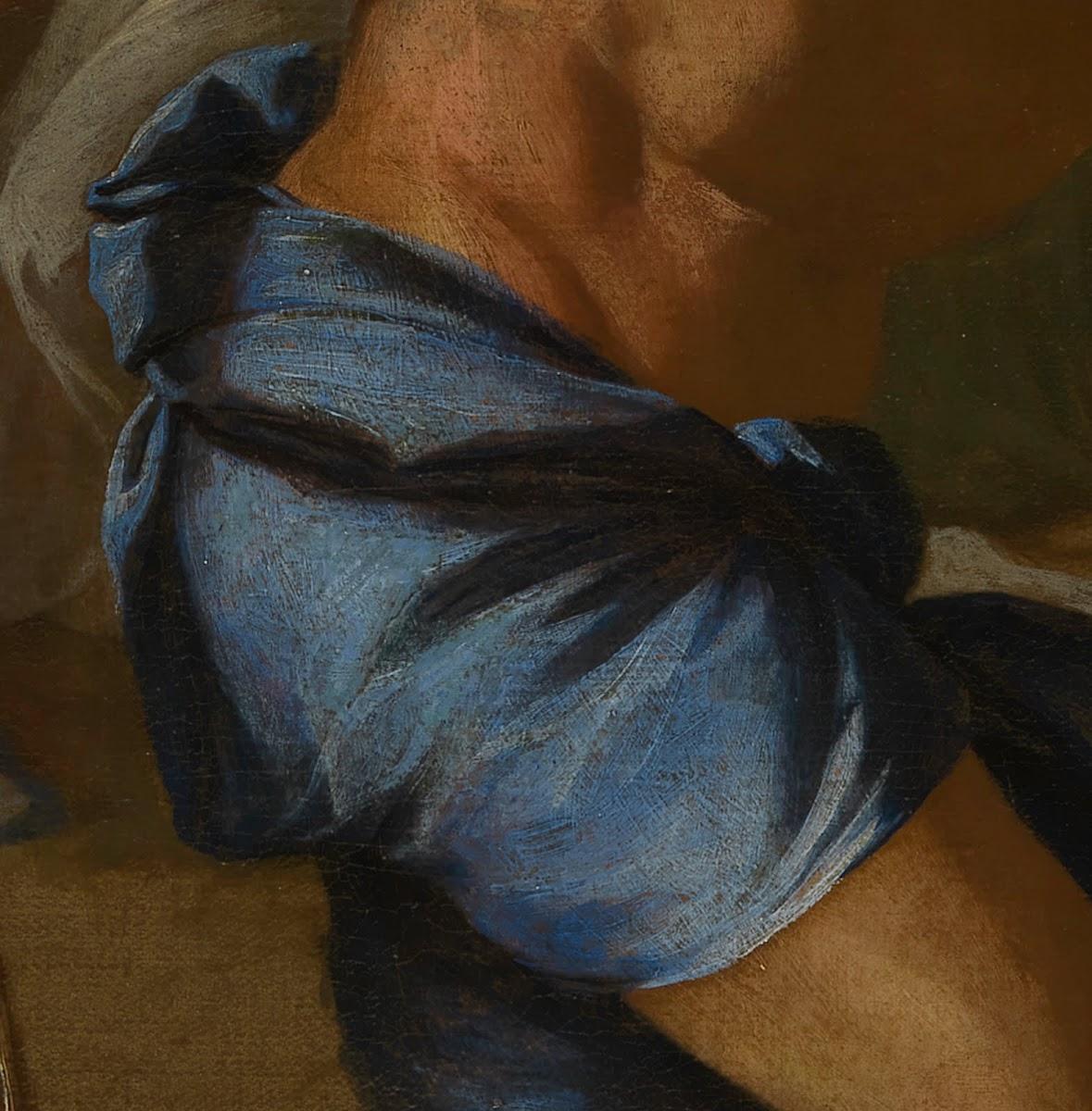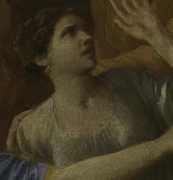 The naked form of the figure is clearly visible in the radiograph, with the streaky brushstrokes of the upper leg and hip visible beneath the almost horizontal brushstrokes of the blue drapery. Finally, there are plenty of smaller pentimenti scattered throughout the picture which are visible to the naked eye, such as in the headscarf of this female figure below. For some reason Poussin decided to extend it down further than he originally painted it, so he was obliged to cover part of the head of a background figure, with the ear of the male figure visible beneath.