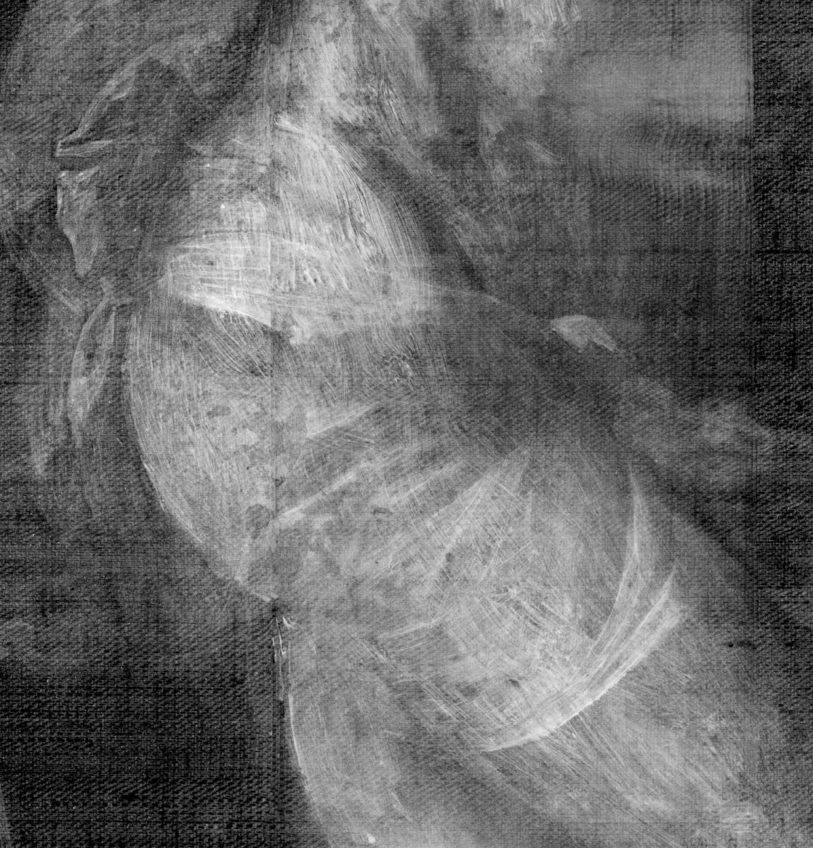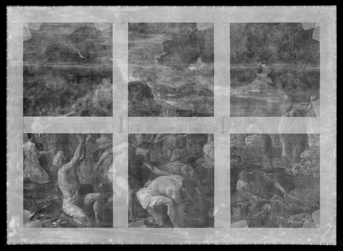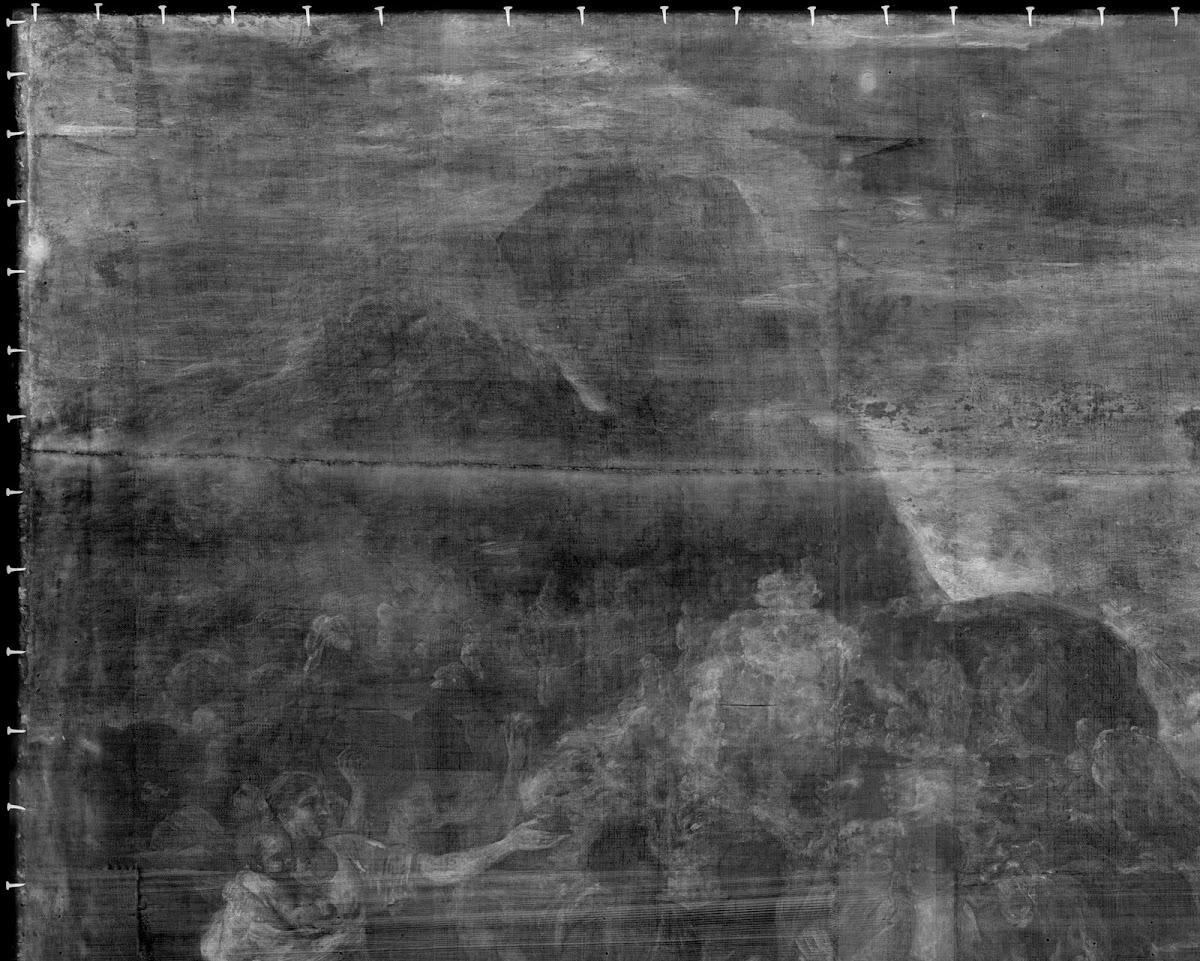 We saw in the earlier post about Poussin’s modifications that some of the smaller changes – such as adding clothing to naked figures – were visible in close up details of the radiograph, but on the whole no large scale alterations are present.