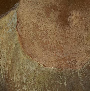 In addition to these we also noted the full extent of another type of old damage to many of the areas of flesh-coloured paint. Several of Poussin’s thinly applied skin tones displayed numerous small pit-like losses, leaving the surface looking broken and with less definition: