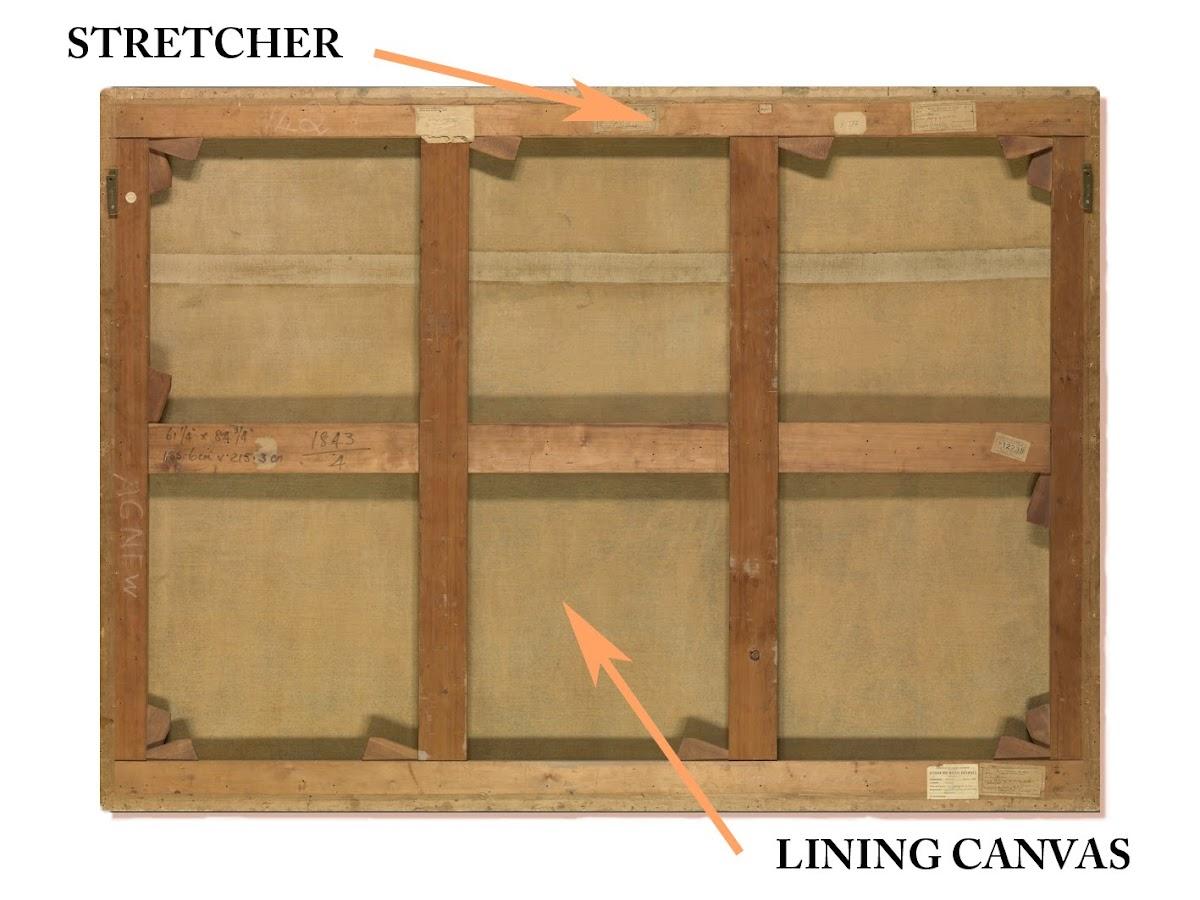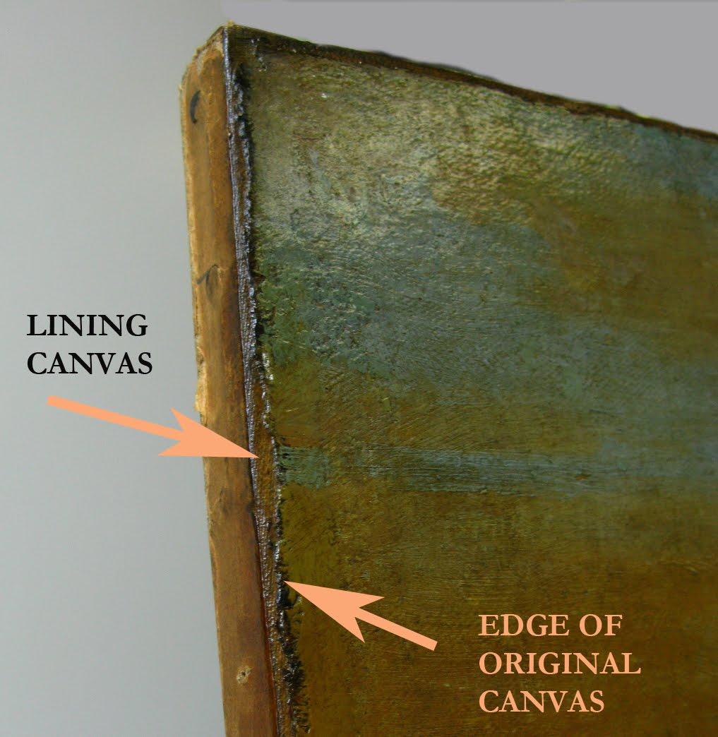The canvas visible on the reverse also probably dates from the nineteenth century. This is a lining canvas, which was bonded to the back of the original to give it greater strength and the rigidity needed to prevent the paint and priming layers from breaking up.