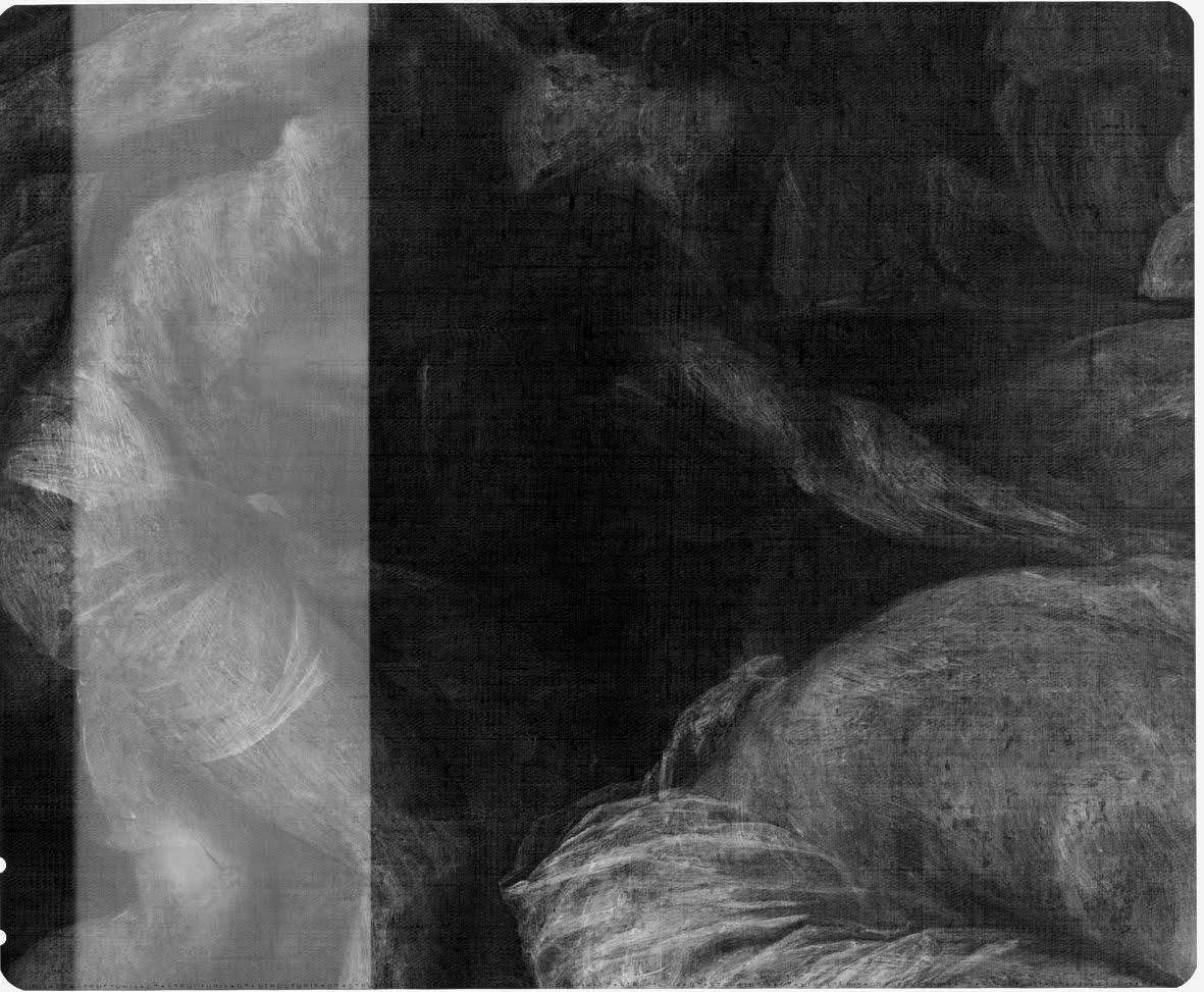 The above image is the digitally assembled radiograph for the painting. It reveals not just the painting on the canvas but also the wood stretcher and all the other components which hold the work together. Radiographs can be very useful for determining the condition of those structural components, particularly for paintings on wood panels. However, there are other times when the image of the stretcher can impede our examination of the painted surface. In these cases we are able to digitally adjust the radiographic image to reduce the effect of the stretcher, as we see in the image below.