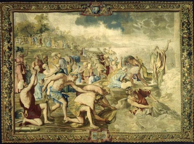 Gantrel’s version of the clouds with details of lightning appears to be supported by the other version of the painting which Buttery may have known about: the tapestry made of the painting by the Gobelins Tapestry workshop between 1684 and 1691:We can see that Gantrel’s engraving closely follows Poussin’s original with one notable exception: the pillar of fire at the extreme right edge of the image has been omitted. More about this in a later post, but what is most striking about the engraving is the sky. We can see that Poussin’s sky – at least according to Gantrel – once had crackling thunder and heavy rain falling over the sea.
