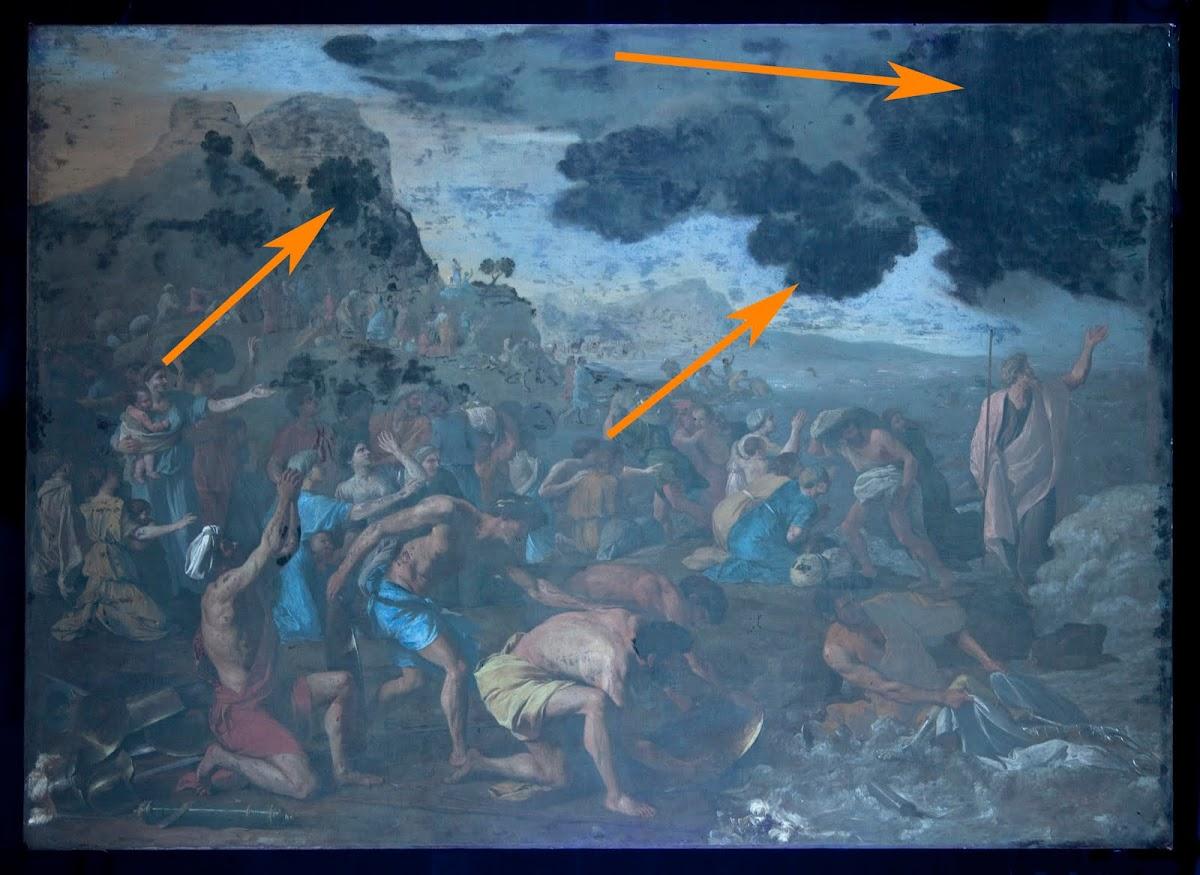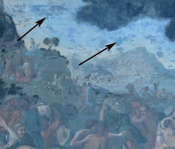Moreover it appears to tell us that the lower part of Poussin’s clouds were dark and heavy, while the upper clouds were paler and lined with light. Very different indeed from the uniformly dark and heavy bank of clouds we now see hanging ominously over the top half of the painting.