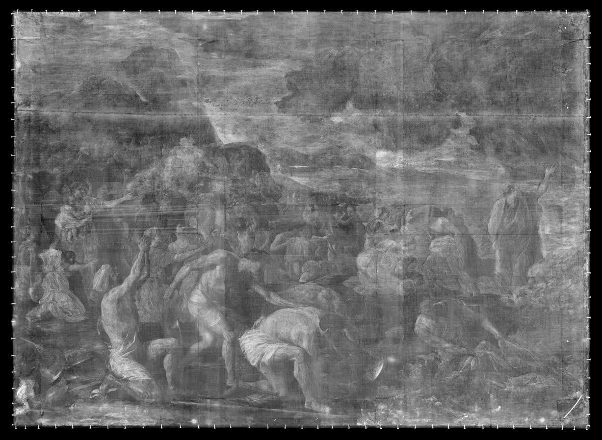 Now we are able to recognize the image of the painting and can make some assessment about the artist’s technique. The fact that the radiograph corresponds with the painting as we normally view it tells us that Poussin did not make wholesale changes to the painting while he was at work.