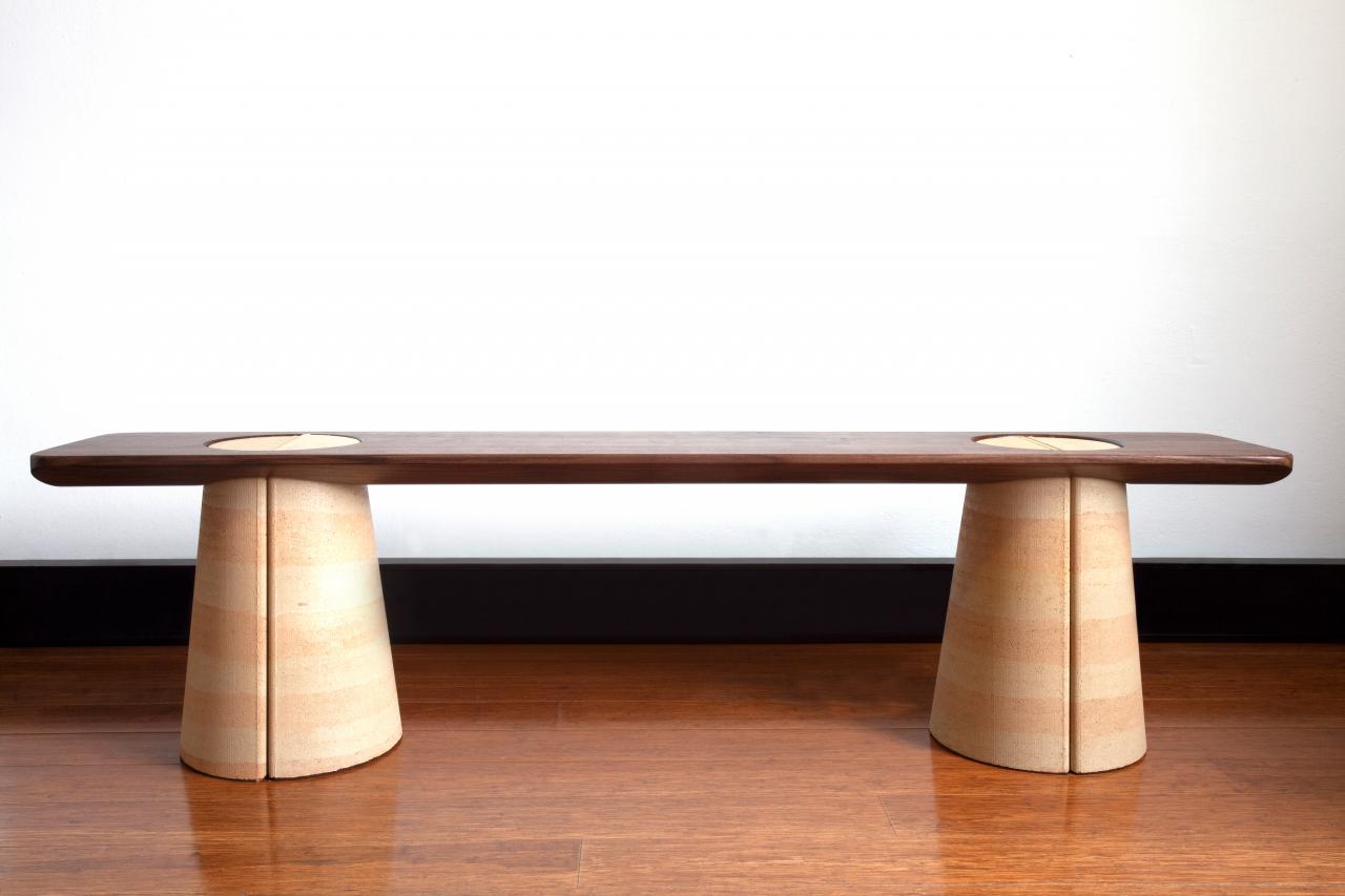 Reinventing an ancient material tradition, furniture designer James Walsh combines rammed earth with recycled glass filings to produce a seductive, sustainable and hard-wearing composite for Anthropic bench. The material is realised in a design exhibiting an intelligent assembly that is beautifully detailed and resolved.