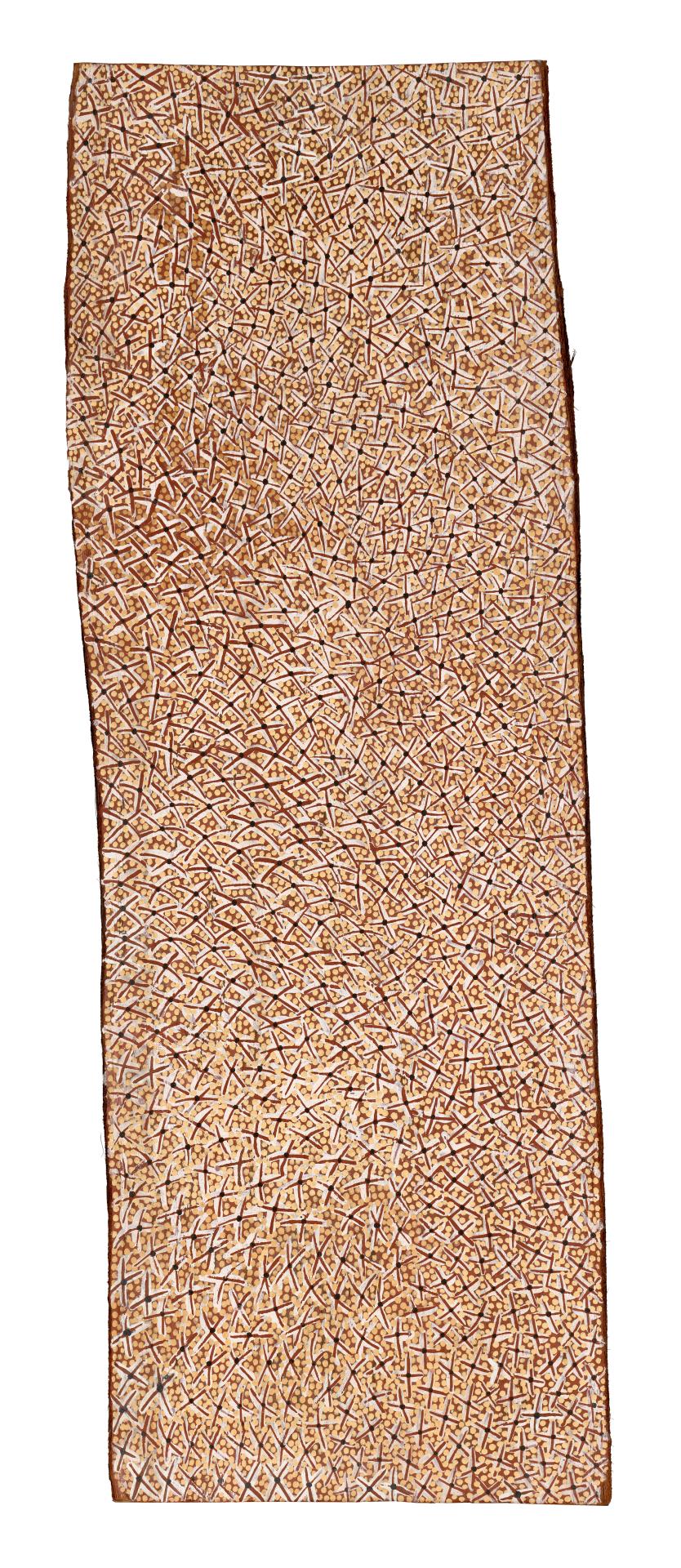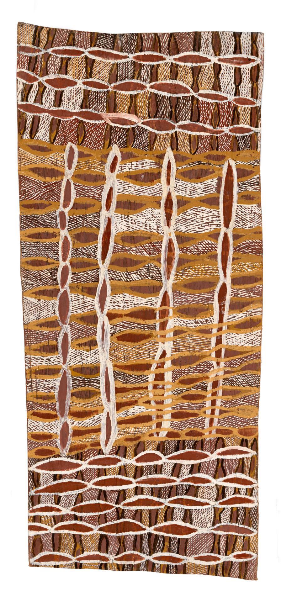 Ms N Yunupiŋu<br />  <em>Wild apple orchard</em> 2008<br /> earth pigments on Stringybark (Eucalyptus sp.)<br /> 173.9 x 69.7 cm<br /> National Gallery of Victoria, Melbourne<br /> Purchased with funds donated by Lou and Mary Senini, 2010<br /> 2010.521<br /> © Ms N Yunupiŋu, courtesy of Buku-Larrnggay Mulka Centre, Yirrkala