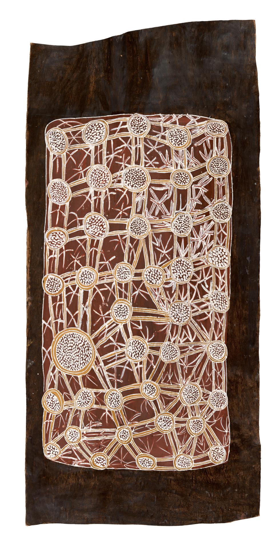 For over 65,000 years, Australia has been home to more than 600 different Aboriginal tribes. Within each of those communities are rich artistic histories and inherited visual languages, which have come to form the basis of contemporary Indigenous art today. Before 1970, no Yolŋu women painted sacred themes on bark or ḻarrakitj (memorial poles) in their own right. In recent decades, however, a number of women artists have taken to these media, becoming renowned both nationally and internationally for their daring and inventive works that challenge Yolŋu tradition and rewrite our understanding of contemporary bark painting.