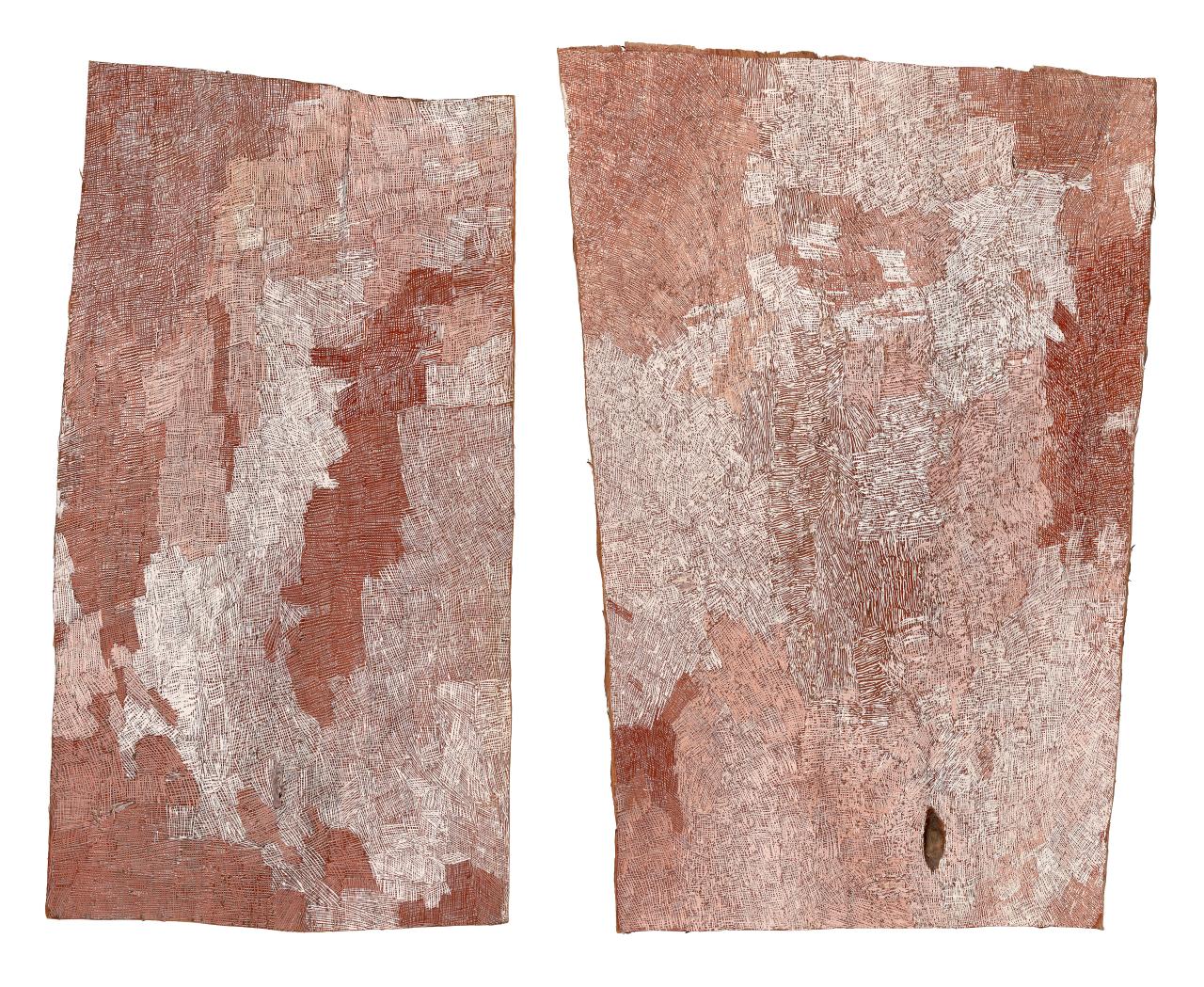 Audiences gain a true sense of Ms N Yunupiŋu’s trajectory as an artist by viewing Gäna alongside other works by the artist in the NGV Collection, including the NGV’s earliest painting by her, Wild apple orchard, 2008. We also can see Nyapanyapa’s sophisticated use of the bark itself, and its materiality, in Pink diptych, 2015, which is made up of two single sheets of bark that abut each other so as to create the illusion of a continued surface.