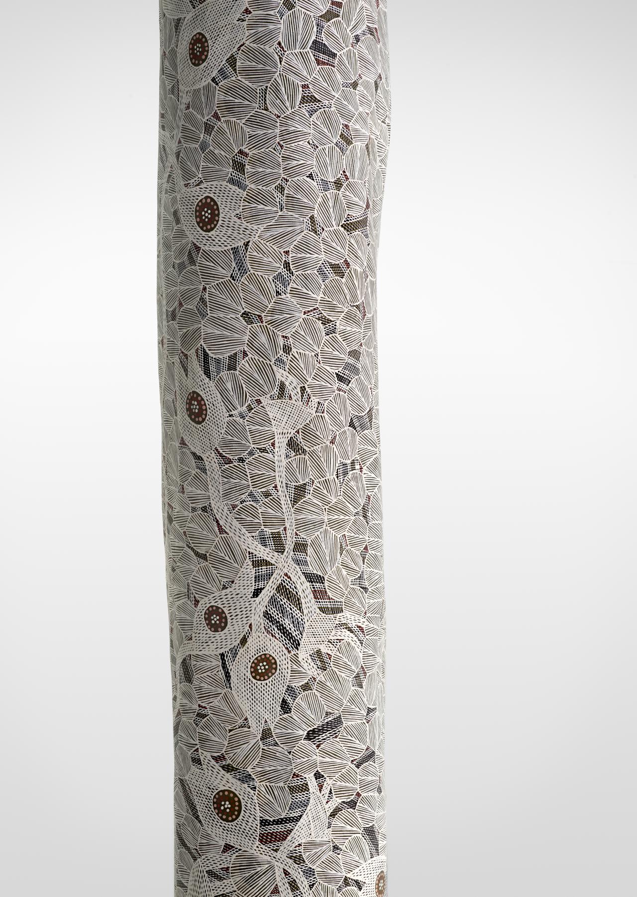 As well as the painted sheets of bark, Bark Ladies includes a selection of ḻarrakitj. Yolŋu artists across Arnhem Land make ḻarrakitj by painting trees that have been hollowed out by termites. Ḻarrakitj were traditionally funerary objects, or ossuaries (bone containers), made from stringybark trees. Through the continuation of customary cultural practices, Yolŋu artists in Arnhem Land continue to assert their sovereignty over land and culture and create a tangible connection to their Ancestors. What were once intended for mourning ceremonies are now produced as a major contemporary art form.