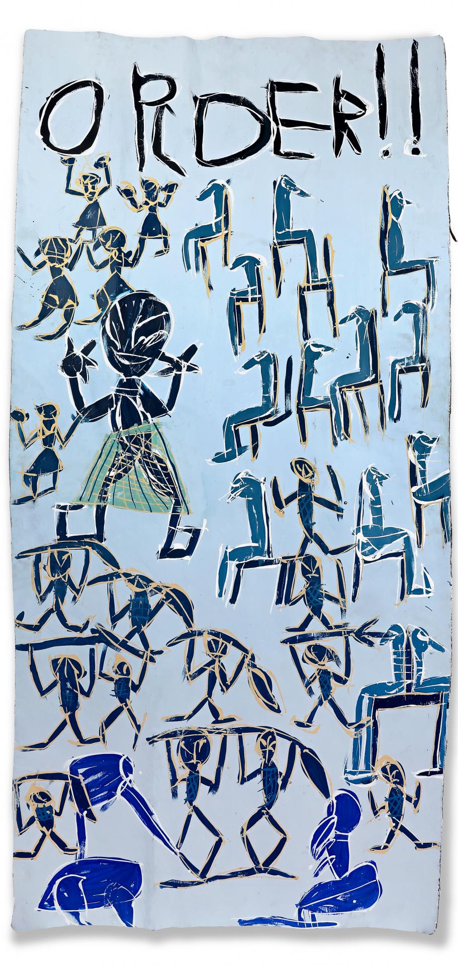 The newest work by Dhambit in Bark Ladies, produced in 2021, is a portrait of former Australian prime minister Julia Gillard. This work represents a major shift for Dhambit, whose previous images were all drawn from Ancestral memories and traditional Yolŋu stories. Order, 2021, shows Julia Gillard standing in parliament, surrounded by limpfaced, unnamed, seated politicians. Yolŋu people appear in the bottom left of the composition, storming the parliament in ceremony dancing with spears.