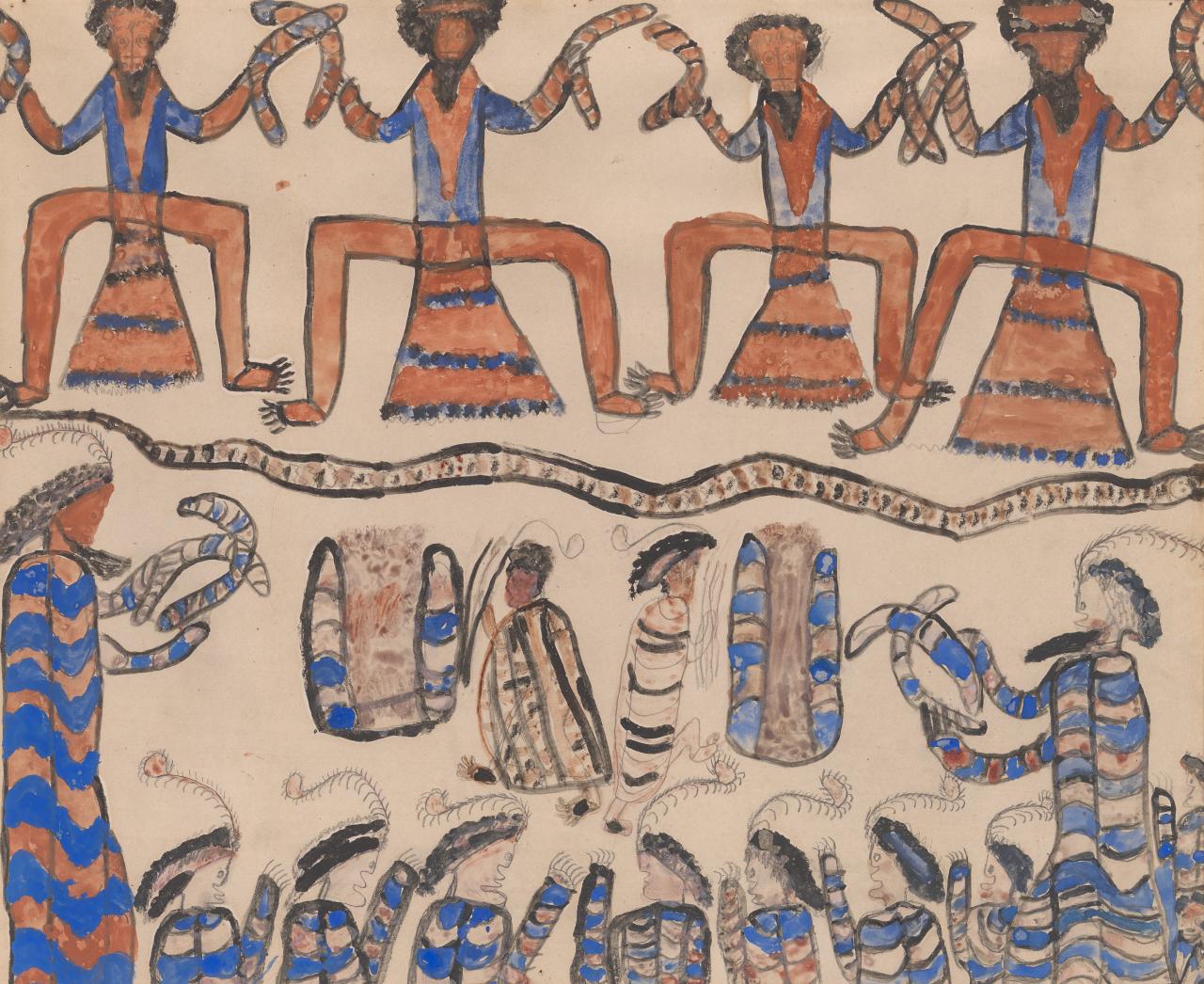 Ceremony with Rainbow Serpent is distinguished by Barak’s startling use of Reckitt’s blue paint and red ochre pigments and his sensitive pencil drawing, apparent in the details of the faces, fingers and lyrebird feather headdresses of the men and women. In parts of this drawing, which has a stark white ground and some negative space, Barak has left the pencil line unadorned, allowing the viewer the intimacy of a glimpse of his way of sketching arms, legs, patterns, poses and faces in profile, prior to applying dark outlines. The emphatic Reckitt’s blue markings on the cloaks are expressions of Barak’s identity in the land and his honouring of culture.