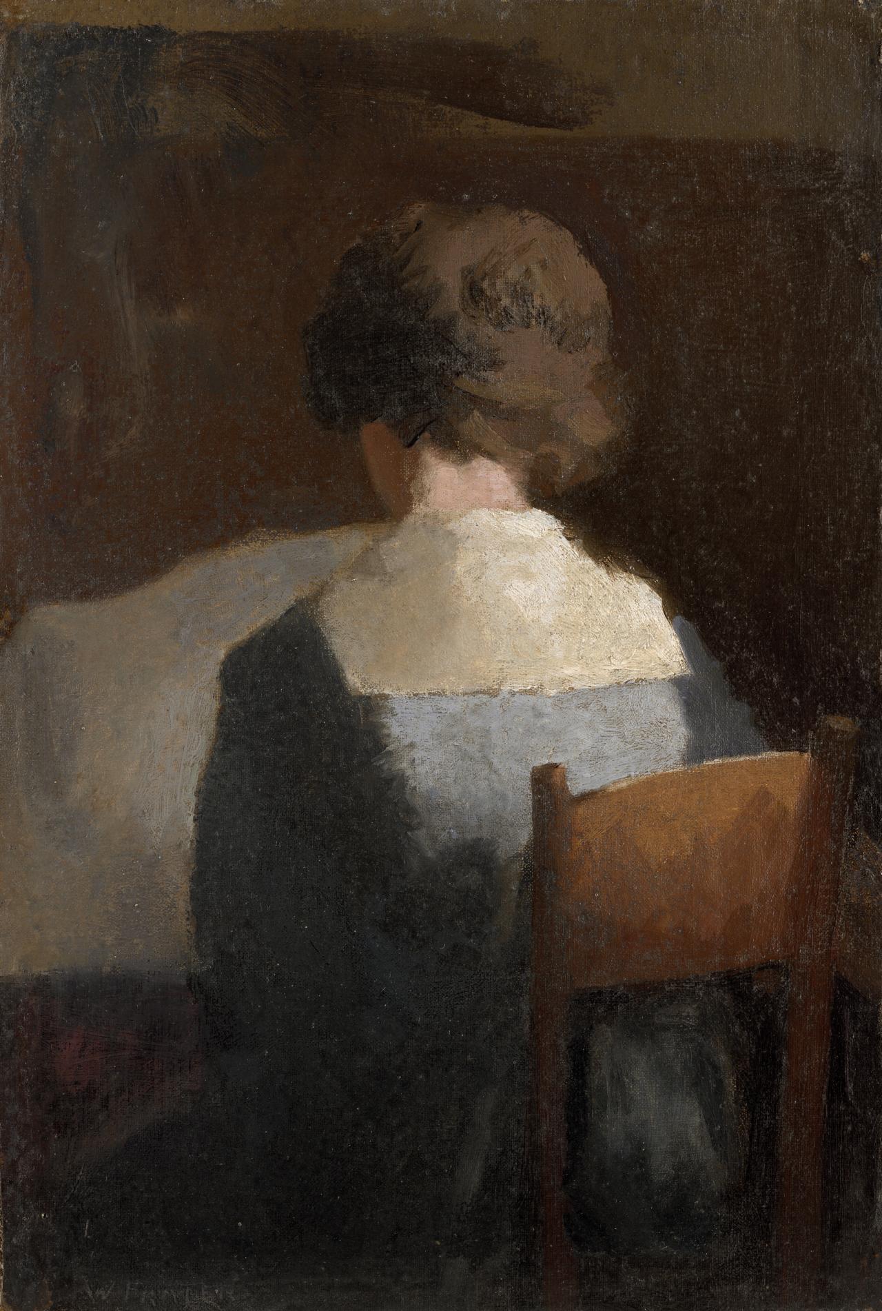 What can a portrait tell us about the relationship between artist and sitter? We might seek out clues in the subject’s expression and the artist’s treatment of their features, in the relaxation or formality of their pose, in their distance or proximity. William Frater’s portrait of his wife offers few such indicators, and in their absence lies, perhaps paradoxically, much of the work’s sense of intimacy, and much of its appeal. Frater and Winifred Dow were married in 1915, the year this work was painted. Dow was a tailor, and here we see her plying her trade, occupied but at ease. Her turned head and unguarded posture suggest a familiarity that a more conventional portrait composition might fail to capture. There is a subtle eroticism, too, in the play of sunlight on her exposed neck and the mystery of her hidden face.