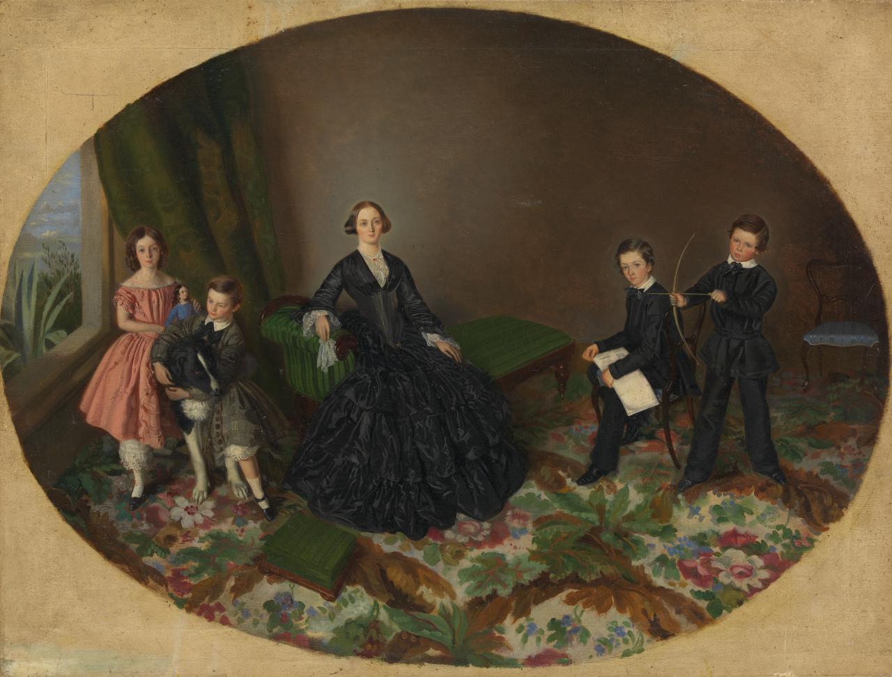 It appears to be a scene of pleasant family life – a young girl with her doll, a playful boy and his bow and arrow, and of course a loyal hound – but this portrait of Maria Elizabeth O’Mullane and her children is rather a snapshot into a family plagued with unfathomable loss and heartache.