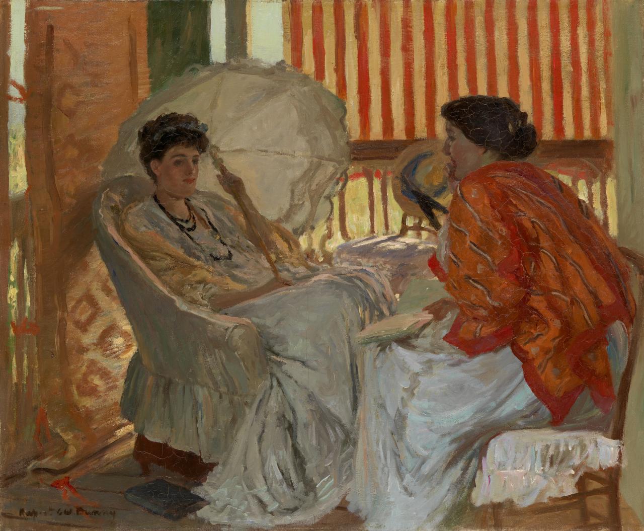 Rupert Bunny’s Chattering contains two stories of love and friendship. The first takes place on the canvas, between a pair of friends sharing confidences in an idyllic garden setting. The Edwardian era was a great period of sociability, and many of Bunny’s paintings from this time capture scenes of fashionable and artistic companionship within which literature, music, dance, and idleness are presented as shared pleasures. This way of life ended abruptly with World War I in 1914, and viewed within this context, these works are imbued with an air of poignant fragility.
