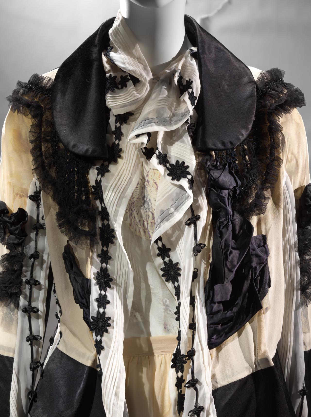 a) 56.5 cm (centre back), 52.0 cm (sleeve length) (jacket); b) 79.5 cm (centre back), 30.5 cm (waist, flat) (skirt); c) 147.0 x 24.5 x 0.5 cm (bow)