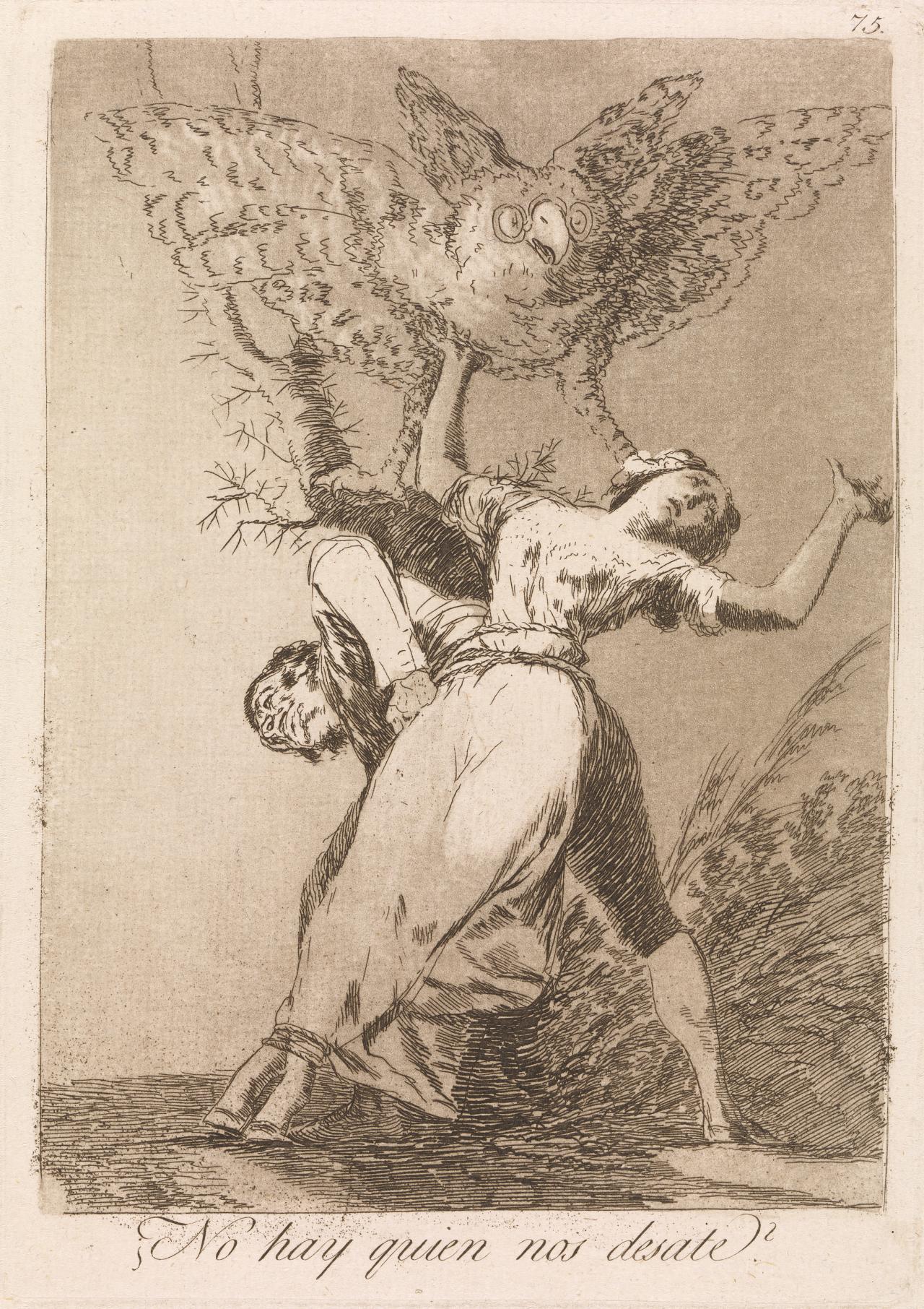 To create No hay quien nos desate? (Is there no one to untie us?), it is likely Goya applied the hard ground first and etched the lines denoting the bound couple and owl. The hard ground would have been removed and a layer of soft ground would have been applied to the clean, dry copperplate and fabric placed on top. The compositional lines are much more obvious than the subtle cross hatched lines created by the fabric. This effect is achieved by either using weaker acid for biting through the soft ground or exposing this area to acid for less time than the linear work.