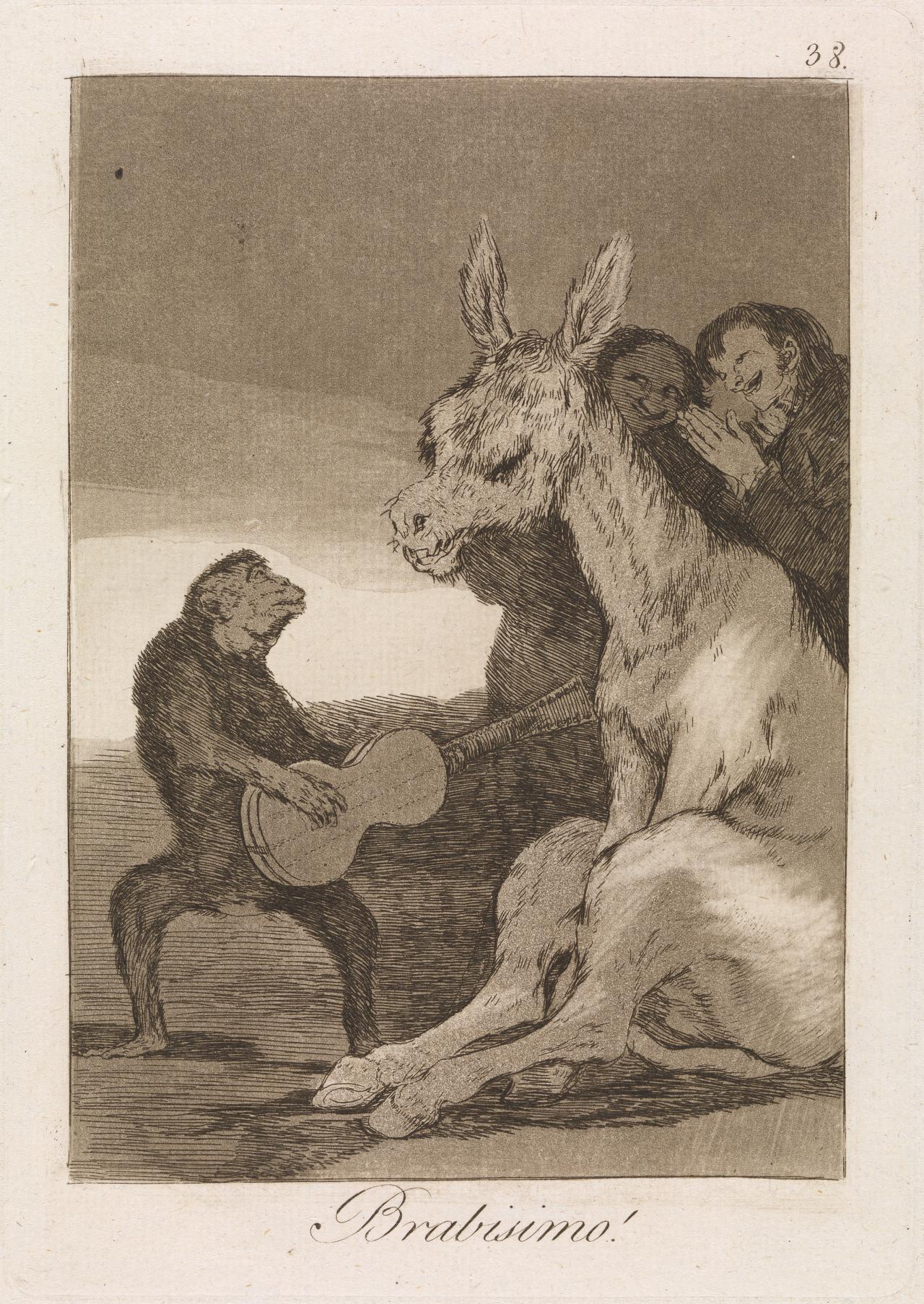 Burnishing requires a special tool made from a hard metal (such as steel) that is used to smooth down areas on the matrix previously engraved or etched. The technique creates areas of highlighting that blend subtly with adjacent darker passages and enable a gradual transition between different aquatint tones. Goya used the technique to great effect to create highlights on the donkey depicted in Brabísimo! (Bravo!). (See figs. 28 and 29). Burnishing tools come in a variety of shapes, but the most useful one has a curved, smooth end shaped like a claw. The ‘claw’ can be turned upside down so the gentle curve is able to burnish quite large areas, or the tip can be used to precisely burnish discreet areas. In addition to producing compositional effects, it can also be used to remove unwanted lines should the artist want to change the composition.