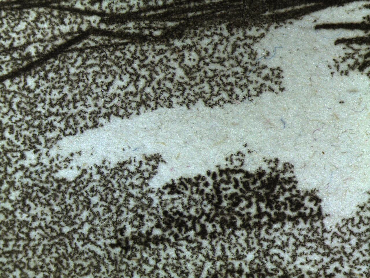 In Obsequio á el maestro (A gift for the master) there is a dark line of ink adjacent to an area of stopping out indicating that the acid pooled slightly at the interface between the stopped out area and the area bitten by acid, causing the copperplate to be etched slightly more deeply at the border. (See figs. 34 and 35).