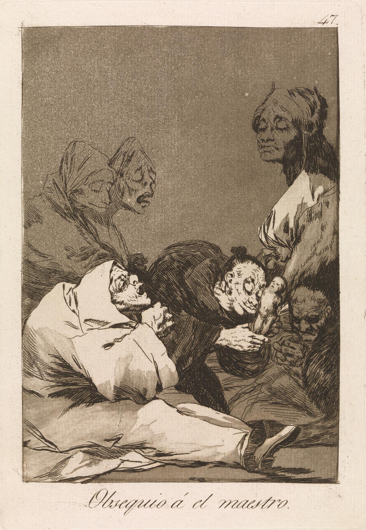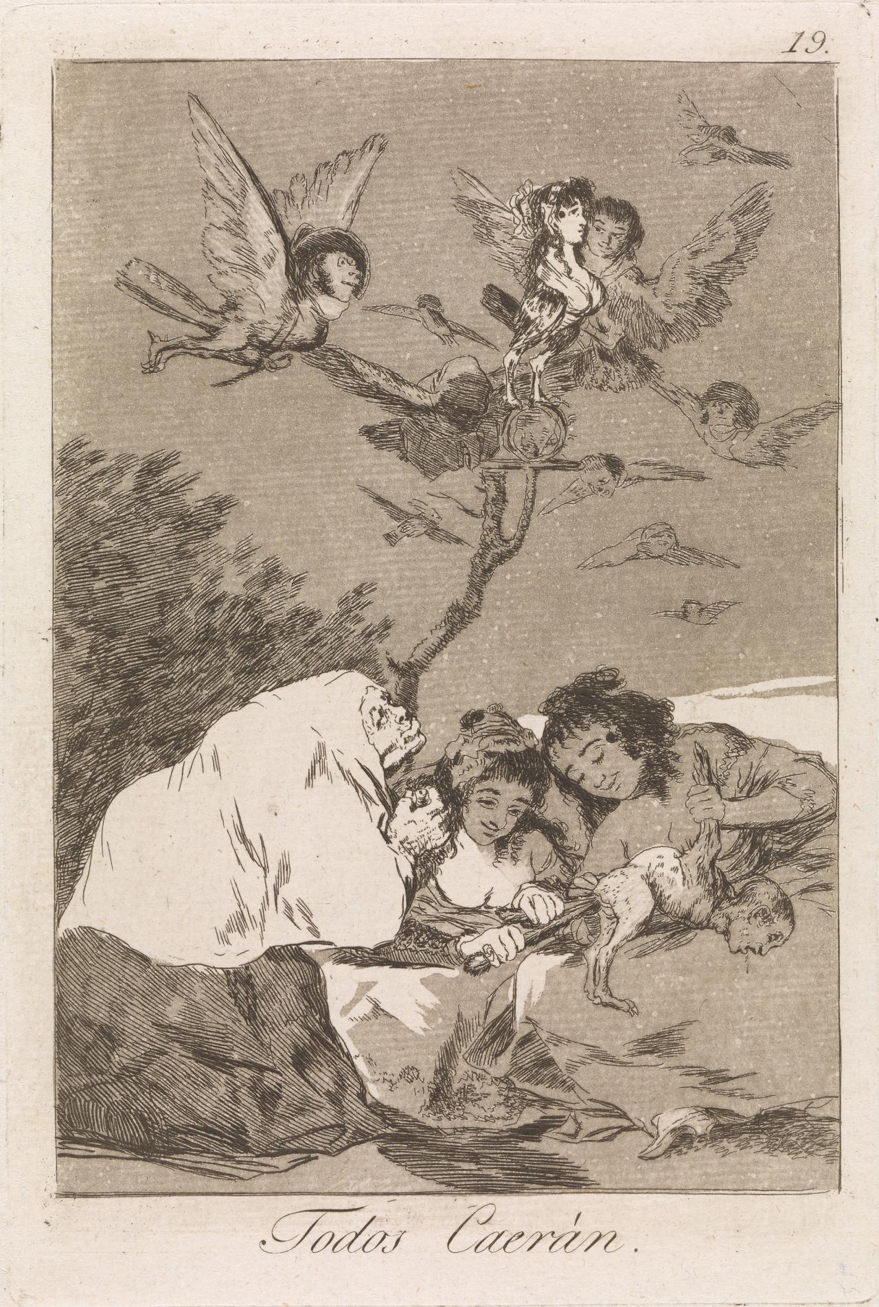 Stopping out varnish was traditionally made with white wax, asphaltum, gum mastic and turpentine and is used to protect distinct areas of the printing matrix from being bitten by the acid. In areas Goya wanted to appear white, he would apply the stopping out varnish with a brush at the beginning of the etching process, so these locations were not exposed to acid at any stage and the copperplate remained smooth. Stopping out varnish was applied in both broad and delicate brushstrokes to the copperplate for Todos caerán (All will fall), the resulting areas appearing as bright white accents on the woman-bird on the perch, the shawl of the procuress, the chest of one of the young sex workers, the light grey garments of both young sex workers and an area of background on the right. (See figs. 30 and 31).