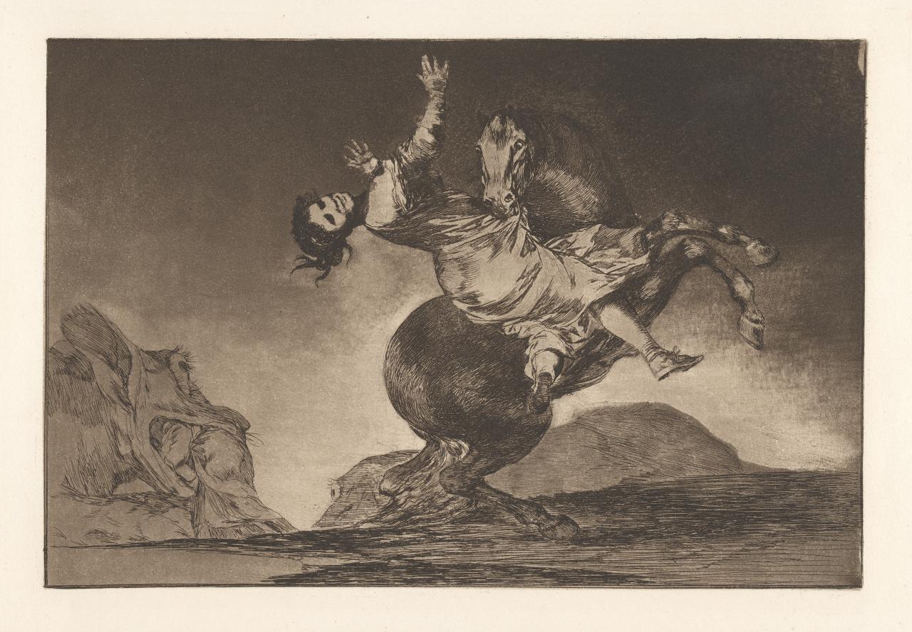 When examining Goya’s prints, the transition between an area that has been stopped out and one that has not, can be quite stark. In contrast, in areas where he used the technique of burnishing to create highlights, the transition is more graduated. In El caballo raptor (The Kidnapping Horse), burnishing and stopping out were used in tandem to create the light region surrounding the horse and figure. (See fig. 36). This effect was achieved by applying aquatint to the whole plate and biting it in acid. Stopping out varnish was then applied in the lightest section with a loaded brush working from left to right. The transition between the lightest section to the aquatinted region was created with a burnishing tool, working in an upwards direction.45