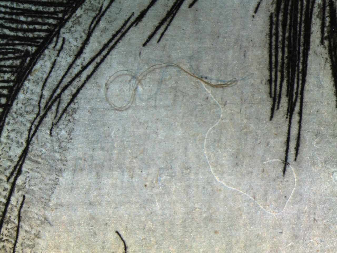 In comparing Goya’s extant working proofs with his editioned prints, it is possible to see the evolution of designs through compositional changes. The impressions from the first editions of the Los Caprichos and La Tauromaquia are likely to have been made under Goya’s supervision and although one was published seventeen years after the other, the printing techniques are very similar indicating they may have been produced by the same printer.62 Both sets are on laid paper in sepia coloured ink; the plates have been clean wiped, and the highlights contrast brilliantly with the etched and aquatint design.63 While the identity of the printer is unknown, he may have left behind some of his DNA in the form of a hair that is stuck to the printing ink in the NGV impression of Origen de los arpones ó banderillas (Origin of the harpoons or banderillas). (See fig. 43).