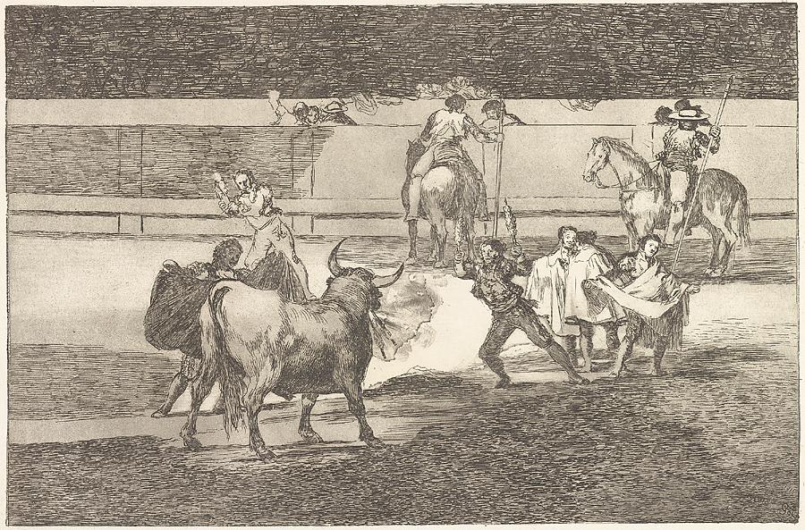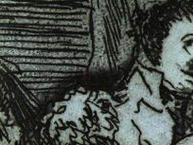 Once most of the linear work had been completed using etching, Goya sometimes used drypoint to accentuate areas of the composition. He used this technique to emphasize the shoulder of the matador on the right in Banderillas de fuego (Banderillas with Firecrackers). (See figs. 13 and 14). A drypoint needle is rounded to a point and is pushed with greater force into the surface of the copper than the etching needle, because, while etching produces a line by physical and chemical action, drypoint produces a line by physical force alone.