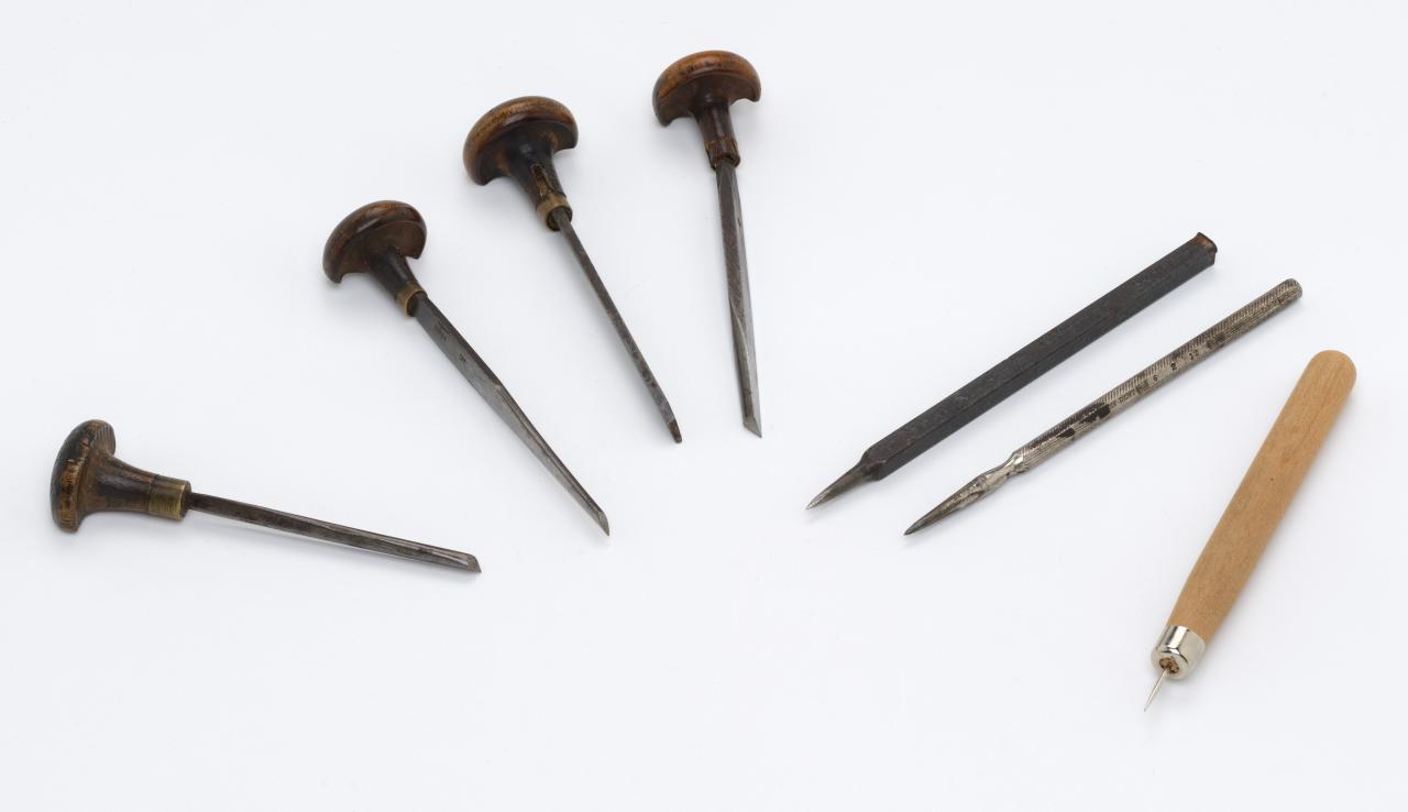 The tool creates a ‘v’ shaped gouge in the copper and to finish a line it is angled towards the surface to exit the copper. This action and the shape of the tool produces a tapered end at the termination point of each line and these can be used to distinguish engraved from etched lines.