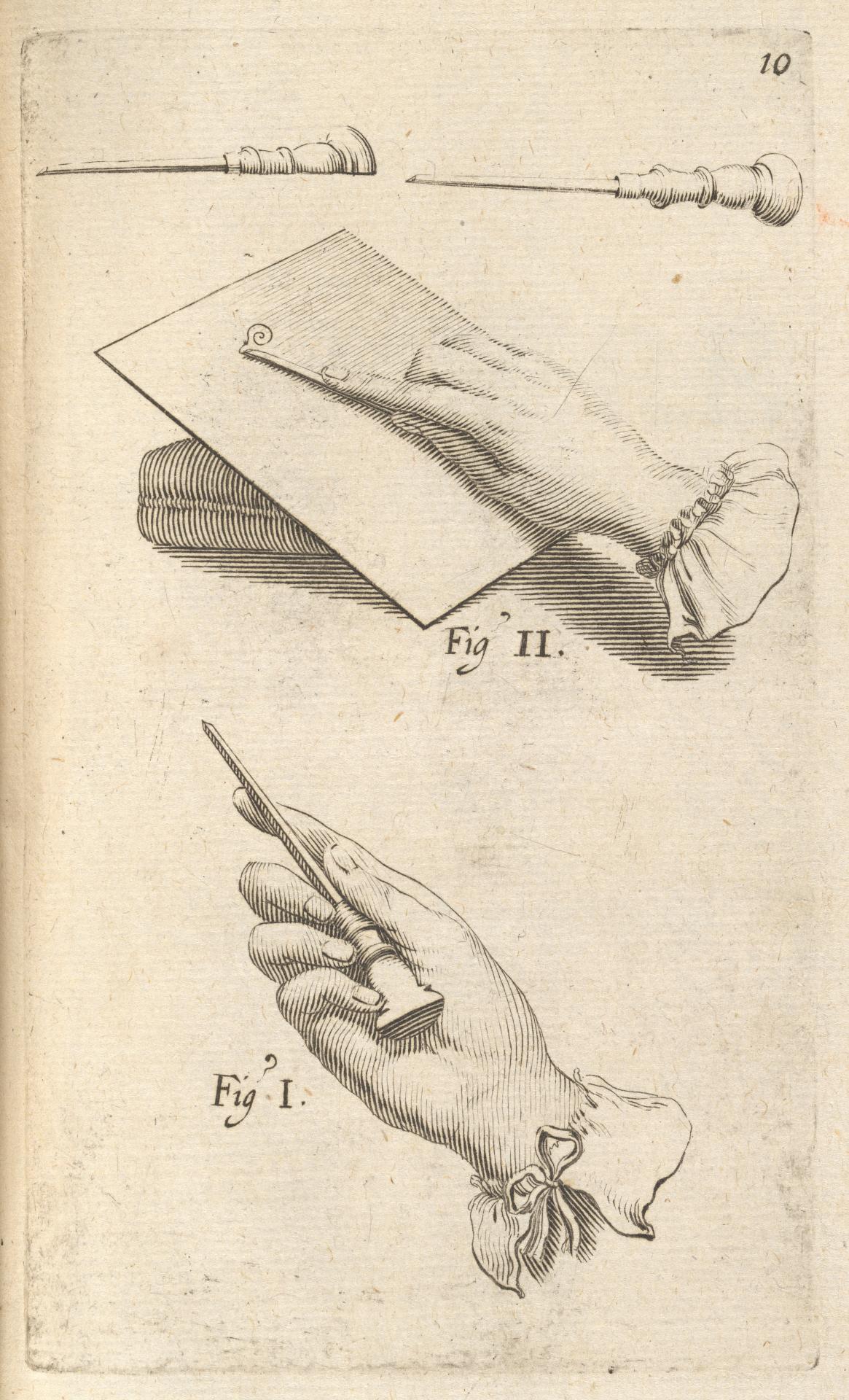 Goya used engraved lines (also called burin) to embellish the smoke from the exploding firecrackers in Banderillas de fuego (Banderillas with firecrackers) (See figs. 13 and 17). The lines are created with a burin, a tool made from a triangular shaped length of metal (such as steel) with one end mounted in a wooden handle while the cutting end is angled and lozenge shaped. (See fig. 15). The tool is pushed away from the body, dislodging little ribbons of copper from the surface of the plate in the process. (See fig. 16).