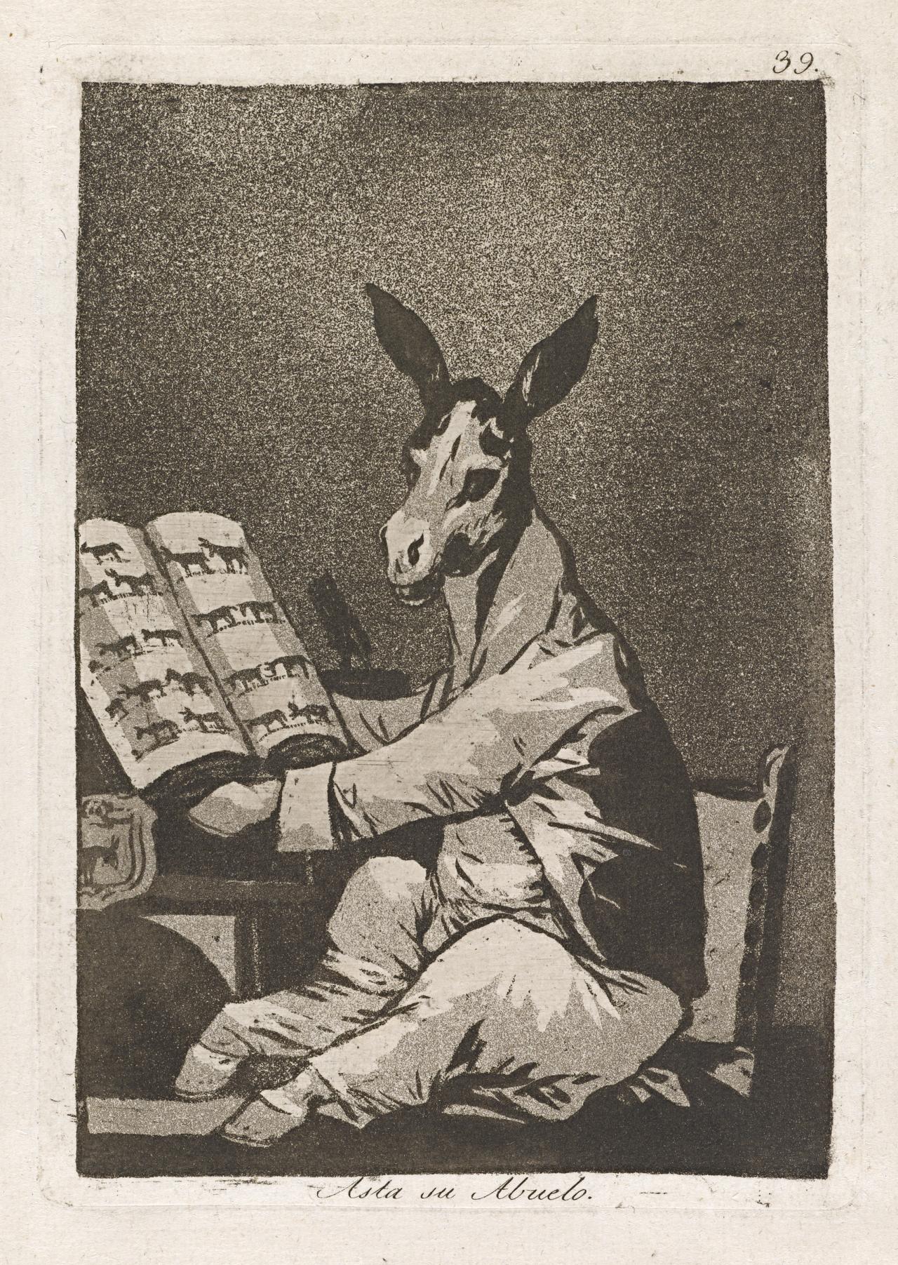 One of the primary methods Goya used to create areas of tone in his prints was dust ground (or dust grain) aquatint. He developed such a command over the technique, he produced several prints including Asta su abuelo (And so was his grandfather) from Los Caprichos solely in aquatint. (See fig. 18).