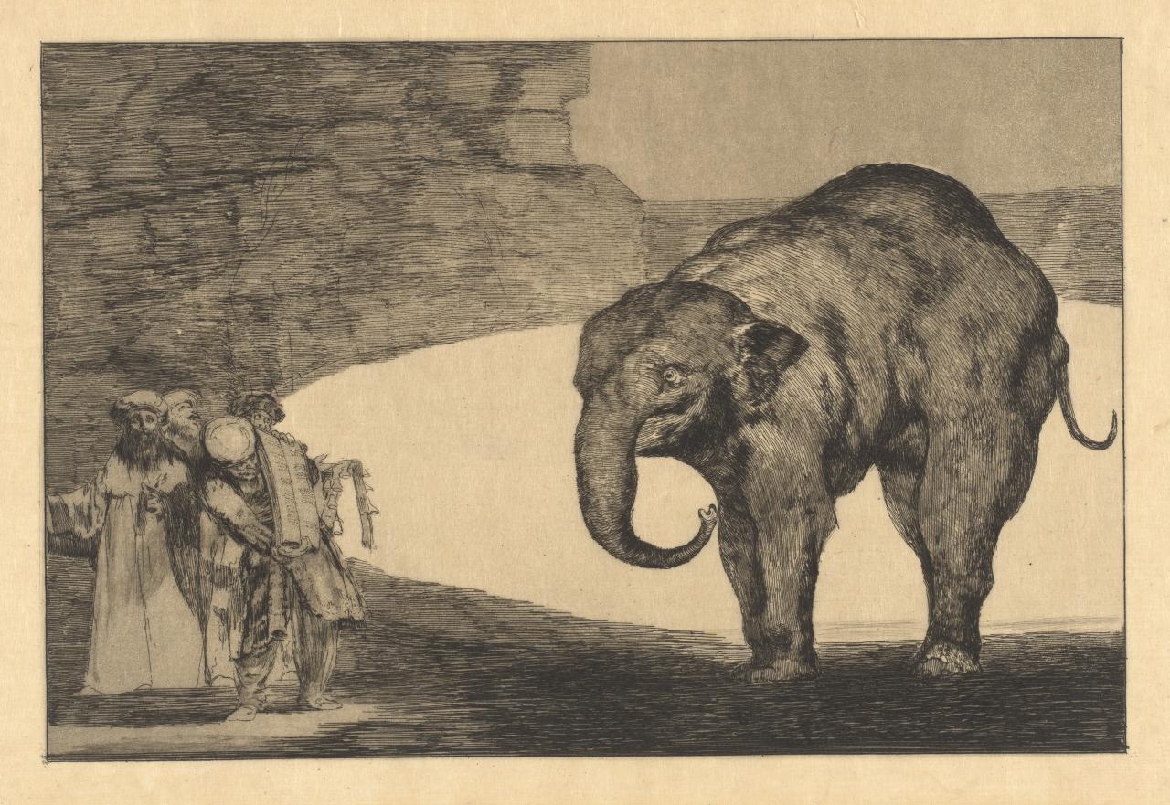 Various recipes for aquatint were published in the eighteenth and nineteenth centuries, but generally they included asphaltum and rosin. Rosin is a solid form of resin obtained primarily from conifers. It is produced by heating fresh liquid resin to vapourize the volatile turpentine components. At room temperature it is solid and brittle, but it melts when heated. The components of aquatint were hand-ground with a pestle and mortar, the particle size varying depending on how much it was ground. Goya may have sifted the dust ground through a muslin bag, gently tapping or shaking it, the more closely it was held to the plate, the more concentrated the resulting layer of dust. Examination of his prints indicates he usually applied aquatint after etching had been completed using a hard ground. His work Disparate de bestia (Brute folly) is likely to have been created by firstly etching to denote the elephant, figures and dark surrounds on the plate. (See fig. 19). This would have been done with stopping out varnish on the plate in the oval-shaped area surrounding the elephant that appears white in the print. Once the lines were etched, the hard ground would be removed from the copperplate by rubbing with a rag and cleaning the plate to the point where a slightly greasy film remained on the surface providing a slight tackiness for the aquatint to adhere to.