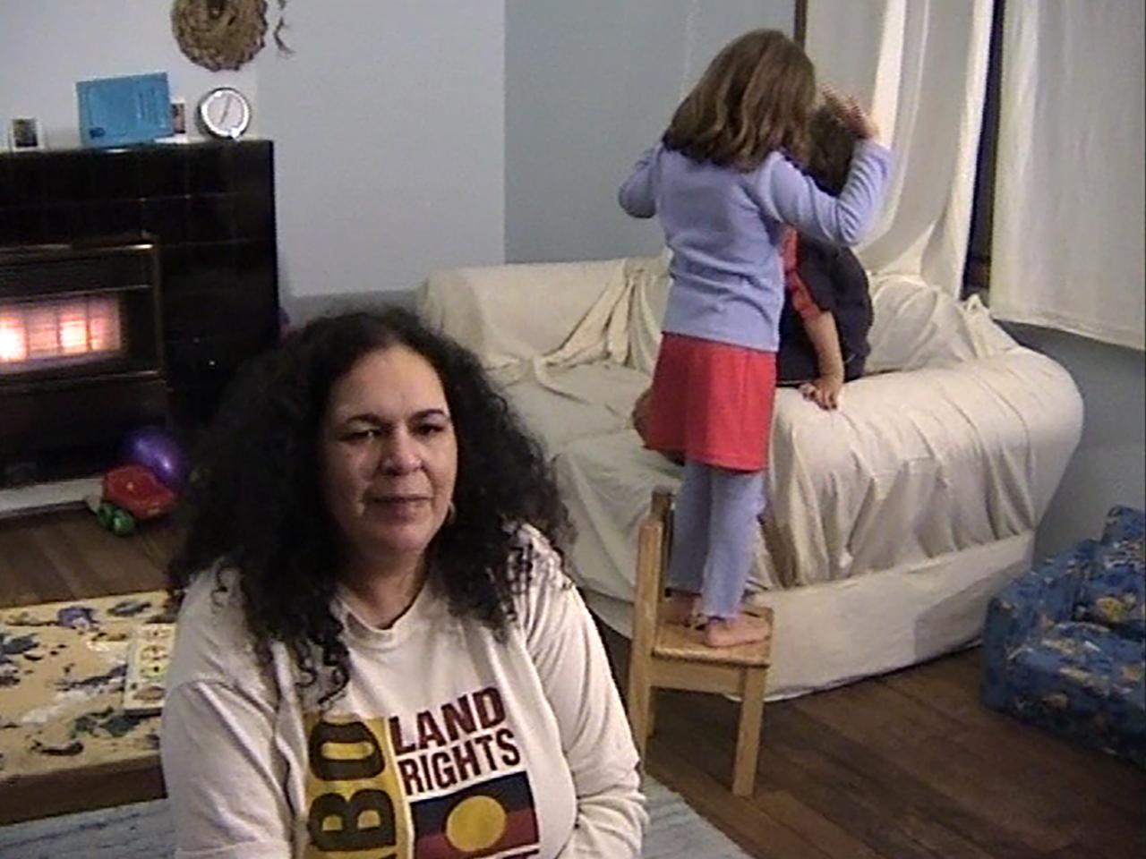 As one of Australia’s most acclaimed contemporary artists, Deacon’s work seeks to subvert social norms through humour. I don’t wanna be a bludger is a film made in collaboration with the late Wiradjuri/Kamilaroi artist Michael Riley, and features Deacon playing her outrageous alter-ego, Delores. The work centres around Delores deciding she no longer wants to be a ‘bludger’ on the dole, but rather, an artist. When interacting with other characters, Delores employs high-energy dialogue to ridicule negative stereotypes that persist about Aboriginal people.