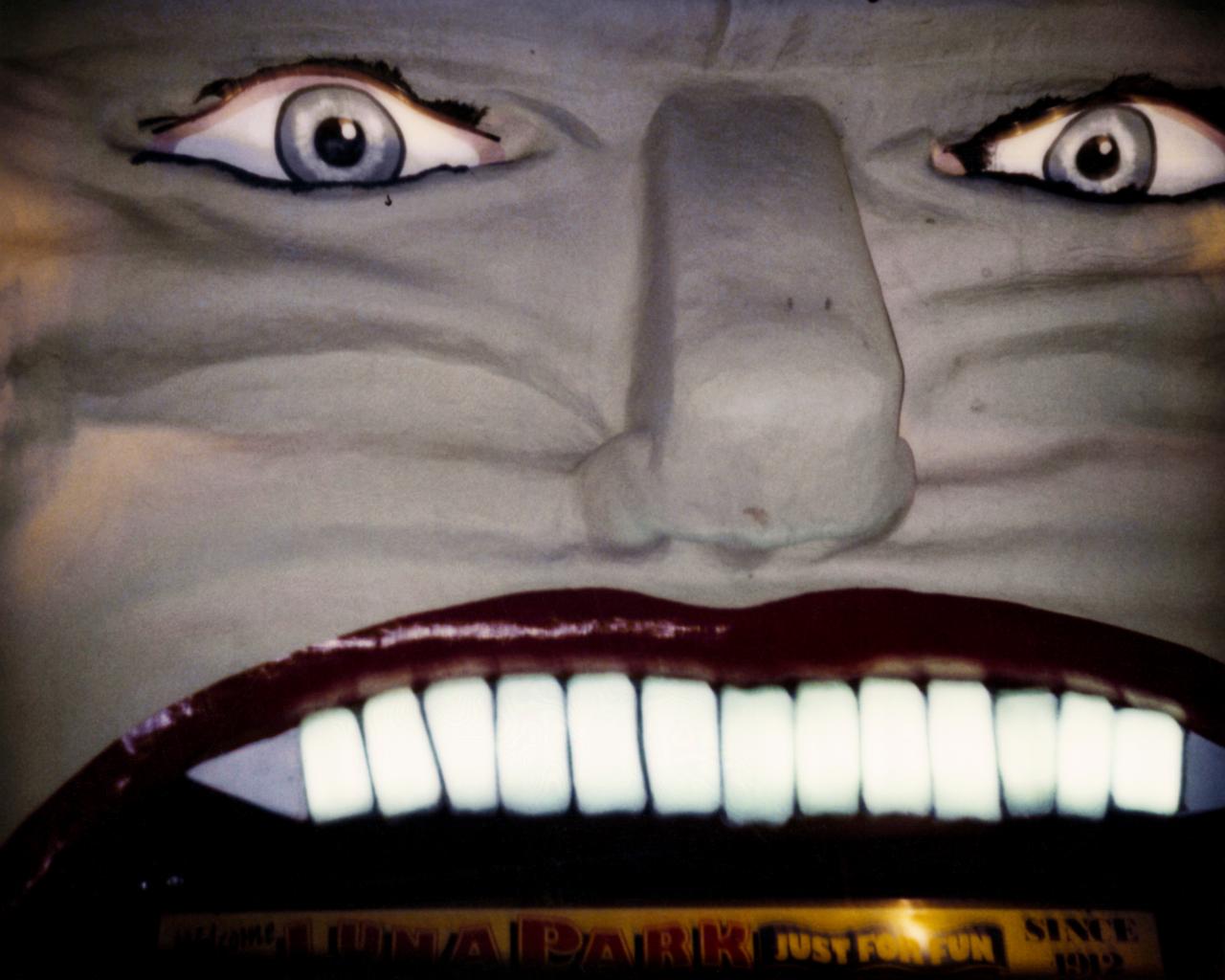 A new work by Deacon that will be featured in the exhibition is her representation of one of her iconic photographs from 1994, Whitey’s watching. The menacing face in Whitey’s watching belongs to the pre–2012 entry gate of Luna Park in St Kilda, Melbourne. Deacon wanted to preserve the face of her childhood, but in doing so has also captured a hallucinatory presence; the wide open eyes and exposed teeth glow with manic intensity. Deacon has transformed this photograph into a larger than life light box which draws audiences in and through the exhibition space.