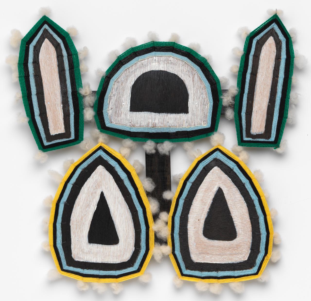 Roy Wiggan is a Bardi man who was born on Sunday Island in 1930. Bardi people’s Country is situated north of Broome on the Dampier Peninsula. Wiggan is known artistically for creating totems that are used by Bardi people to perform ilma (open ceremonies using objects). In the 1990s, Wiggan made a number of ilma including Sunrise with clouds, which tells the story of dawn along the Dampier Peninsula. The cool blue and green tones of the shaded earth and yellow highlights of the sun, complete with clouds formed with cotton and wool, capture a magical time of the morning.