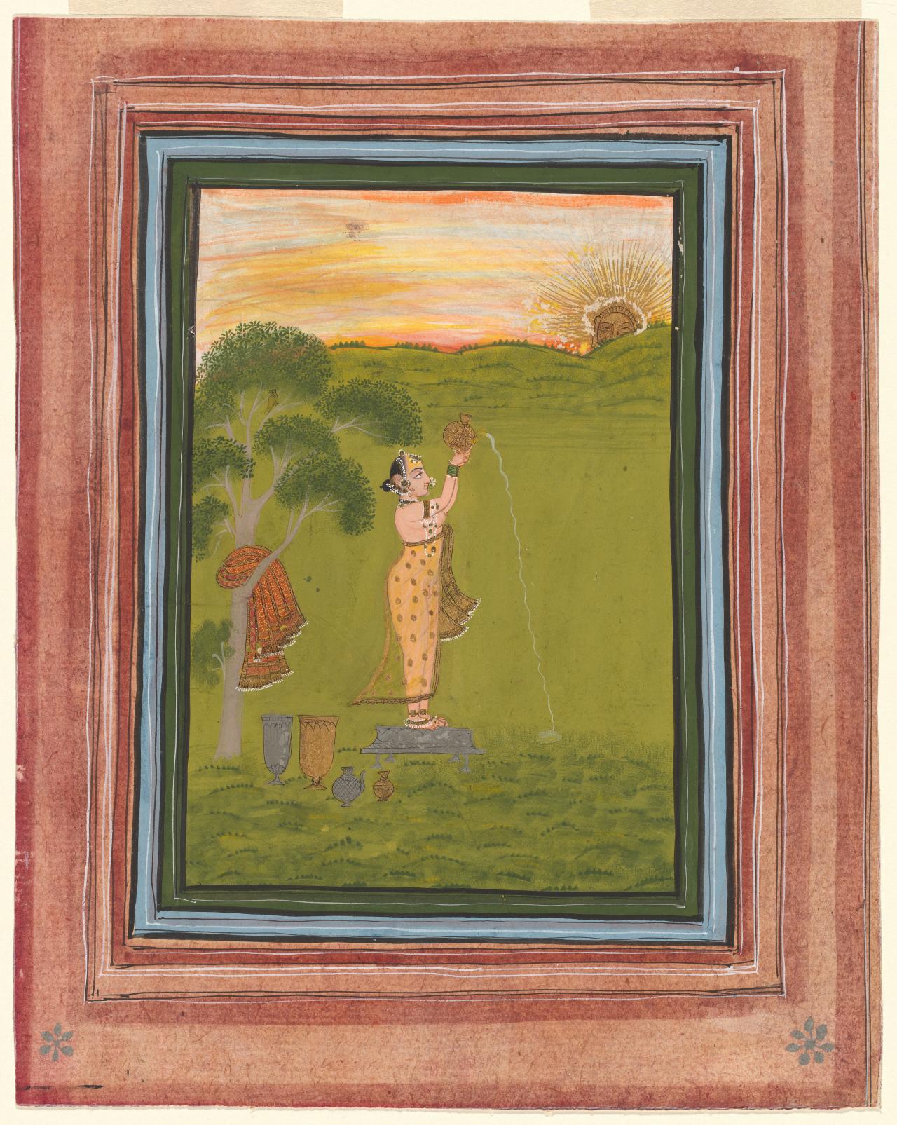 The sun-filled sky and glistening landscape pictured above immediately brings a sense of warmth within. This nineteenth century watercolour depicts a woman performing Surya puja, a worshipping of the sun. In India, Surya is the sun god in Hindu culture and is seen to be one of the most powerful gods. It is believed that Surya is an incarnation of Lord Vishnu, the creator of the material universe and the Soul of all. This act of worship involves offering water to the sun in order to banish demons (in our mind and our body) that lay on the path between the self and the sun. This form of prayer brings illumination within, and this artwork reflects just that.