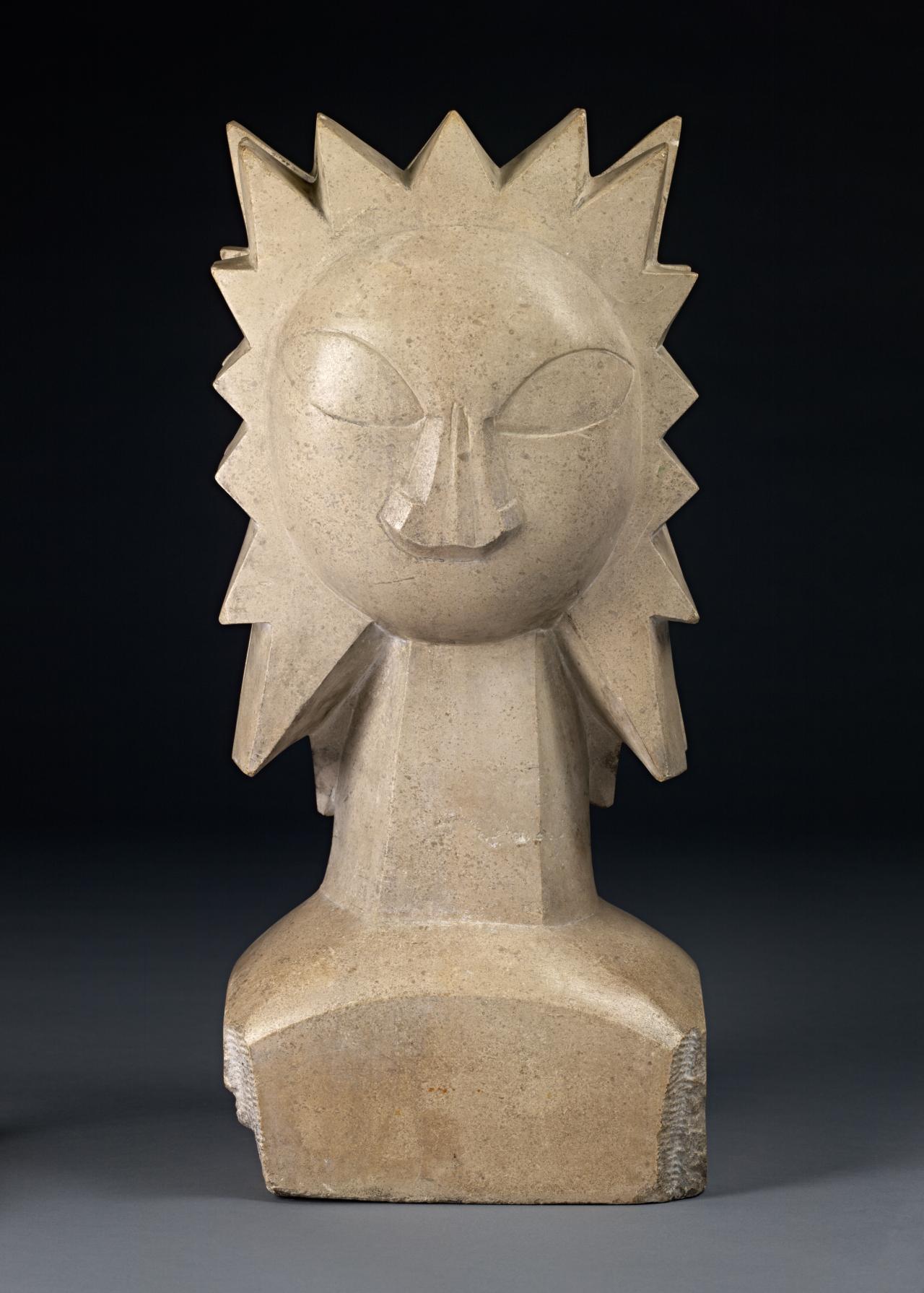 Throughout history, the sun has long been an important symbol across many cultures. In ancient Egypt, Amun-Ra was known as the King of the Upper Egyptian Gods and father of the pharaoh. He was responsible for all life on earth, and beyond, making him one of the most important gods in their culture. Modernist sculptor Jacob Epstein was fascinated by this, and around 1910 he created a series of Sun God, Sun Goddess and Sun Worshipper carvings including Sunflower. This carving’s abstract qualities serve to expand, rather than restrict, the artwork’s meaning. As a symbol of the Aesthetic movement, Sunflower can be simultaneously read as the plant from which it derives its name, a face resembling the flower, and a personification of the sun itself.