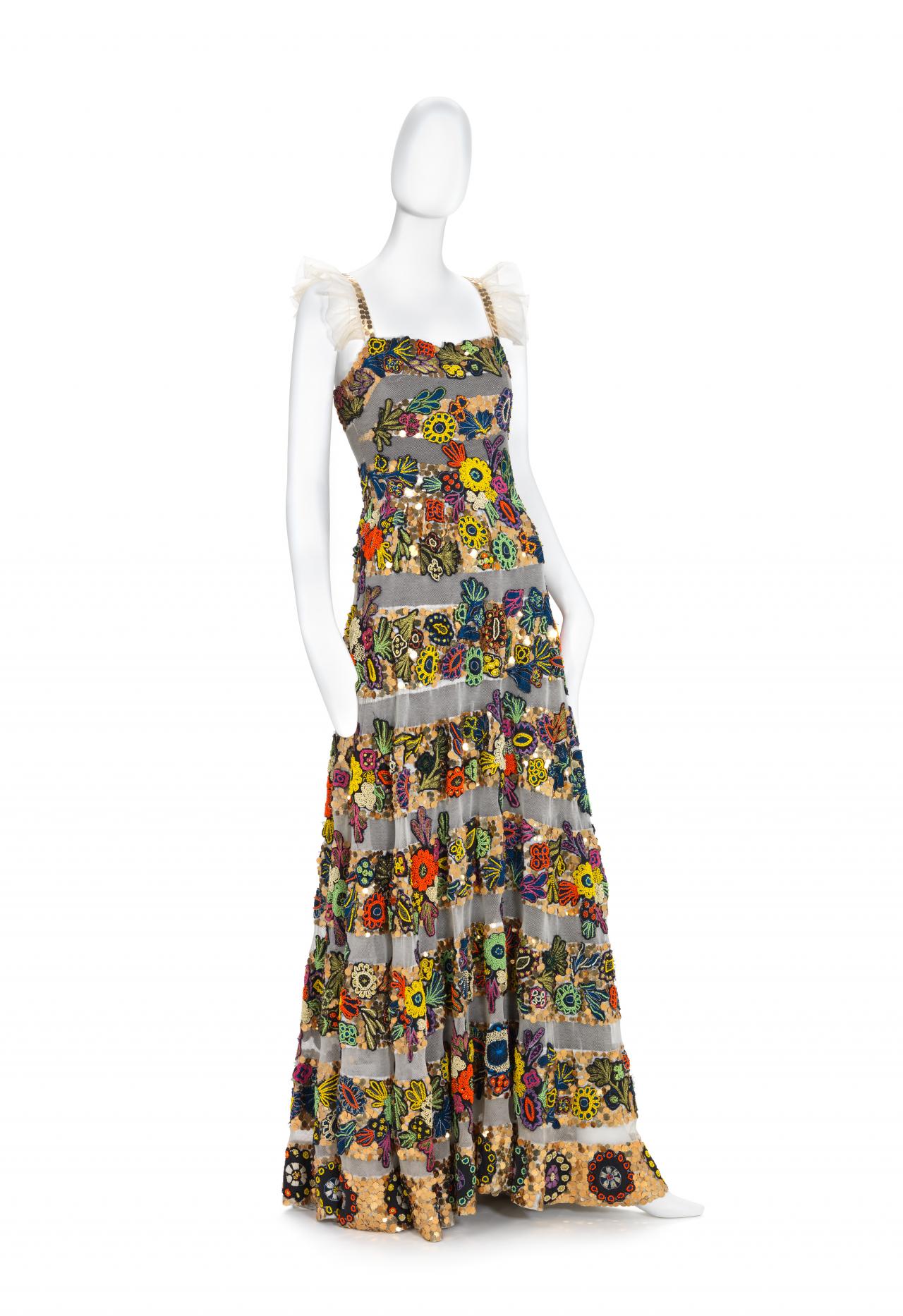 After a visit to Mexico, Brazilian designer Isabelle Capeto created a collection inspired by the country’s rich art and textile traditions. The textiles industry in Mexico holds historical and cultural importance, dating back to the pre-Hispanic period.The Alegra dress boasts strong, festive colours of reds, yellows and greens. The flower motifs are immersed within gold metal sequins that glimmer in the light. Together, the colours and decoration on this floor-length dress echo a vibrant and glowing summer landscape.