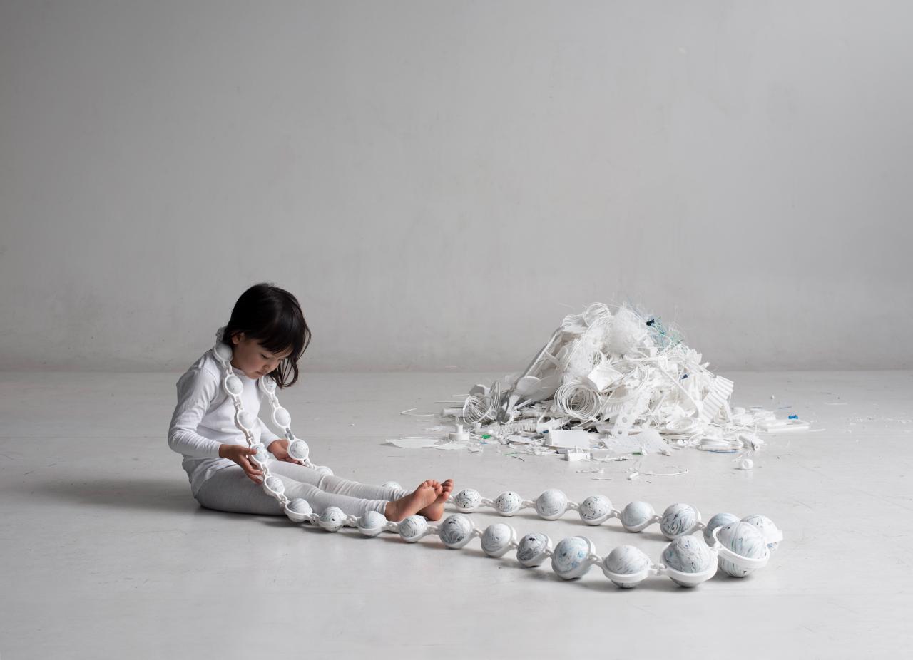 From repurposing the old to creating the new, Sampling the Future features the work of boundary-breakers and future-makers. See a selection of new projects by some of Australia’s leading experimental and speculative designers focused on the problems of today including how we save our coral reefs and analysing the physical impact of the virtual cloud. A standout work is this Polylactic acid chain by Kyoko Hashimoto, Guy Keulemans and Matt Harkness. PLA (polylactic acid) is the most popular form of plastic used in 3D printers. These machines eat and excrete tonnes of PLA daily in thousands of maker-spaces around the world. Manufactured within a mix of petrochemical and biochemical supply chains, it is both recyclable and biodegradable in theory, but rarely done so in practice. These necklaces present recycled PLA sourced from maker-spaces in the form of uniquely patterned beads captured in 3D-printed collars. Practically, the work demonstrates new uses for waste PLA. Each bead in the necklace is shaped like a sphere, envisaged by the designer as a fundamental shape representing the universe.