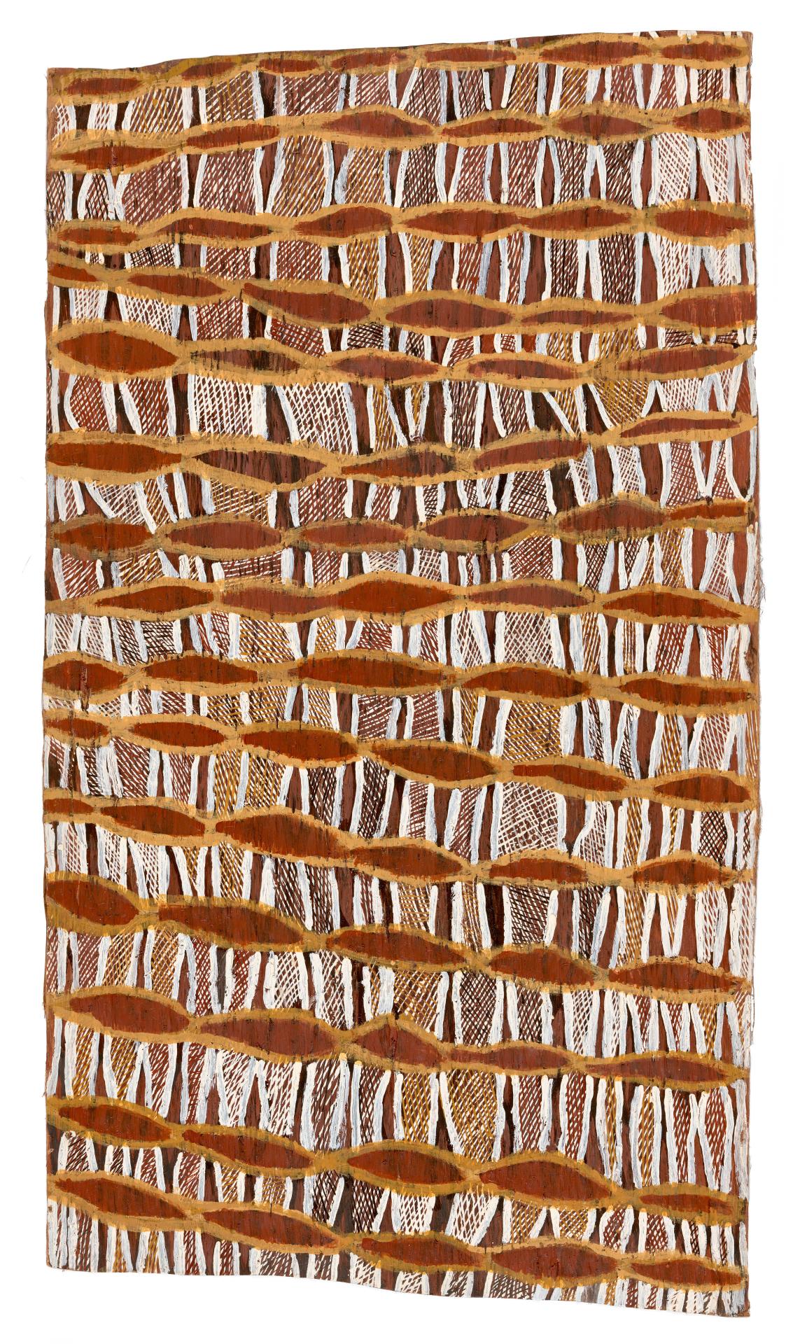 Later in December, visitors to NGV International will be greeted with an expansive, breathtaking floor display in Federation Court that features the work of Naminapu Maymuru-White and introduces Bark Ladies: Eleven Artists from Yirrkala. The exhibition is filled with colourful and daring bark paintings and larrakitj (painted hollow poles) by women artists working out of the Yolngu-run art centre, Buku Larrngay Mulka Centre (Buku), situated in Northeast Arnhem Land. One such work is Barrupu Yunupiŋu’s Gurtha (Ancestral fire) which represents the Gumatj miny’tji (sacred designs) that embody gurtha (fire). The Gumatj language, Dhuwalandja, is itself known as the tongue of flame, and is believed to incinerate dishonesty. Horizontal and vertical lines represent the different intensities of flame, smoke and ash as Yunupiŋu shows the fire in a macro view, close up and intense, stressing its importance to the Gumatj people.