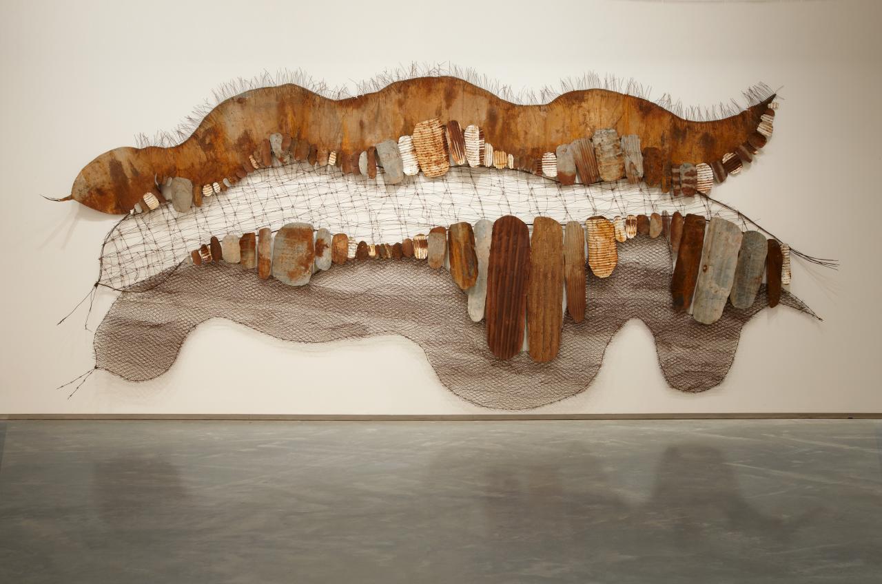 Materiality is at the centre of Found and Gathered: Rosalie Gascoigne | Lorraine Connelly-Northey opening this week at The Ian Potter Centre: NGV Australia, Federation Square. Transforming the found and discarded into the surprising and beautiful is a craft mastered by both artists in fascinatingly different ways. Since 1990, Connelly-Northey’s strong desire to undertake traditional Aboriginal weaving resulted in a rediscovery of her childhood bush environments of the Mallee and along the Murray River. Here she learnt more about a customary Aboriginal lifestyle and throughout the years has produced a number of contemporary sculptures based on traditional possum skin cloaks, including this one. The barbed wire within this cloak signifies the desecration of Aboriginal skeletal remains, occasioned by the construction of an unsealed road near Swan Hill. The circular forms suggest different modes of transport using this road. The fringe of the cloak is made up of hands and cultural artefacts, representing the hunters and gatherers whose remains have been upturned by settler Australian societies.