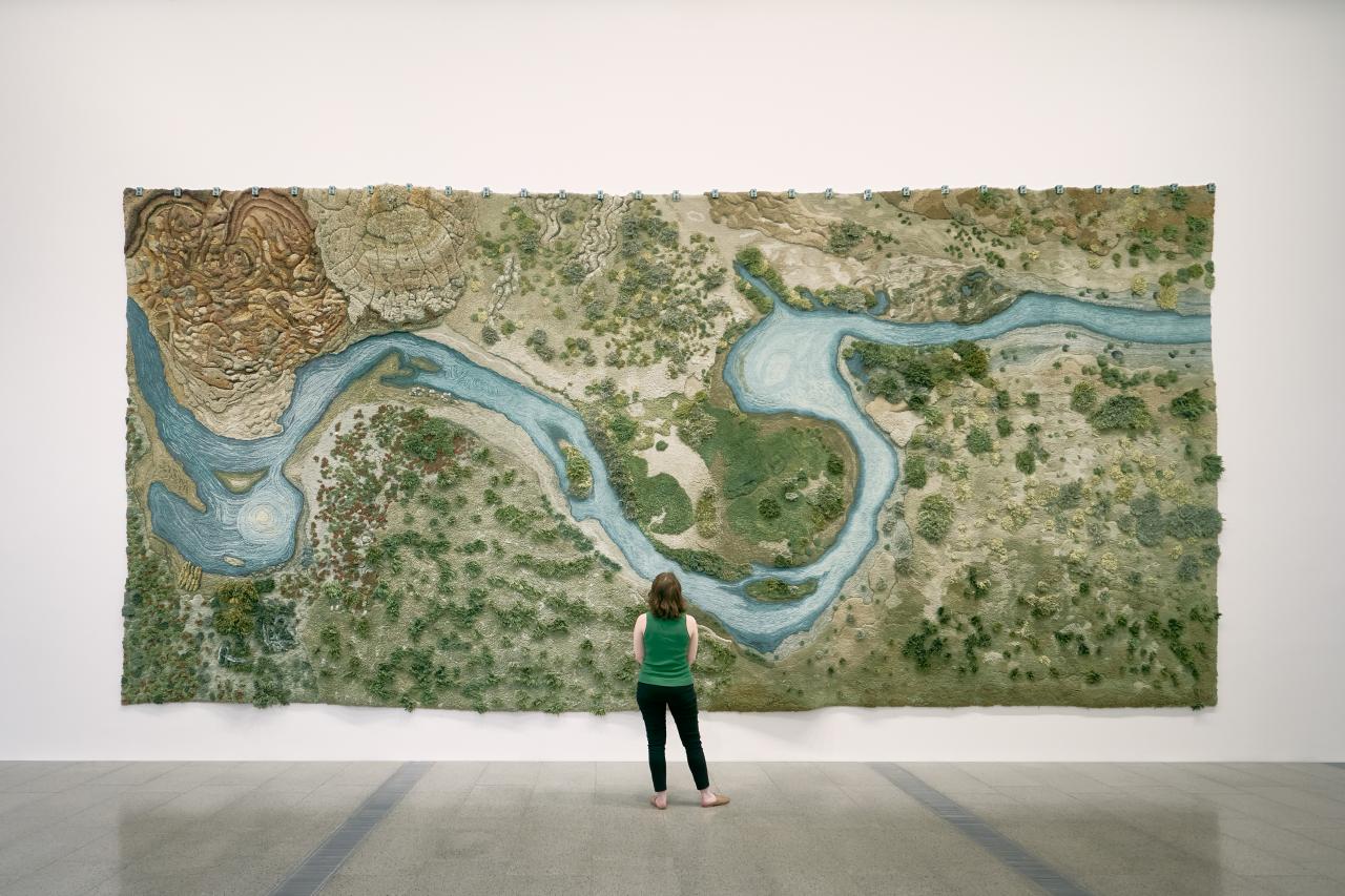 Many of you will be familiar with Alexandra Kehayoglou’s NGV Triennial 2017 work Santa Cruz River, which at more than seven meters in length, commands the opening gallery space in We Change the World. In this work, Kehayoglou takes a contemporary approach to the historical practice of rug making to create a work that documents and draws attention to landscapes under threat from development. Santa Cruz River depicts a section of Argentina’s last free-flowing glacial river, which has much Indigenous cultural significance and is home to many unique and endangered plant and animal species. The work responds to the Argentine government’s controversial decision to approve the construction of two Chinese state funded megahydroelectric dams along the river, which will severely impact its ecosystems.