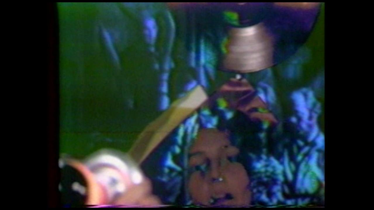 TV in and TV out is a situational videotape shot with two cameras and taped in front of a monitor. One performer (Suzanne Harris) couldn’t see her own image, while the second performer (Tina Girouard) was in the control room with Sonnier, although these positions change during the tape. The performer who is isolated from her own image and from the TV set is dependent upon the other, who has microphone contact with both the control room and the isolated performer … The necessity for communication is intensified by the frequent switching of television stations, when one performer can respond to only audible cues. The soundtrack includes the dialogue between the performers and Sonnier as they discuss the situation and respond to what they can see or hear of the TV programs. As in Sonnier’s other tapes, props such as light bulbs and a record disc are used. The objects within the video space are often manipulated as puns on the special effects generator. For example, a bulb is displayed through a piece of cardboard with a rectangular hole, mimicking the quadrants possible through special effects. The camera’s focus on the TV screen and then on a performer within a quadrant parallels the commercials heard on the soundtrack. As in many of Sonnier’s other tapes, TV in and TV out is unedited. However, there is much off-screen information that extends, by implication, the video space into the control room. Consequently, the tape is about modes of signalling and transmitting information, sometimes involving a psychological interchange between the performers as they continuously switch roles.4