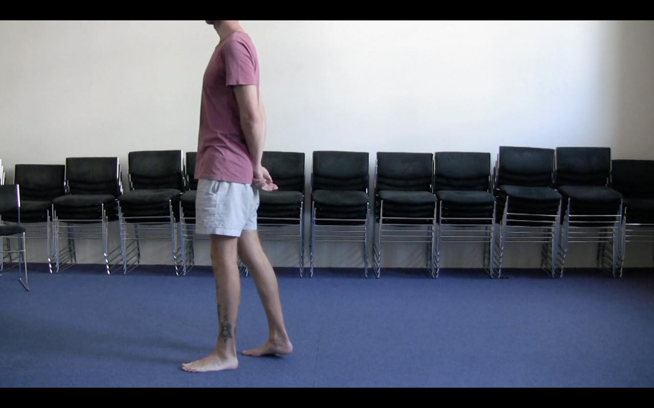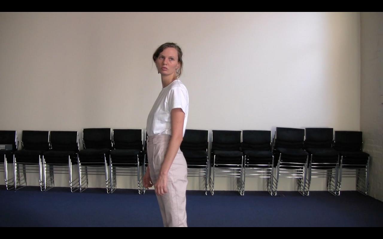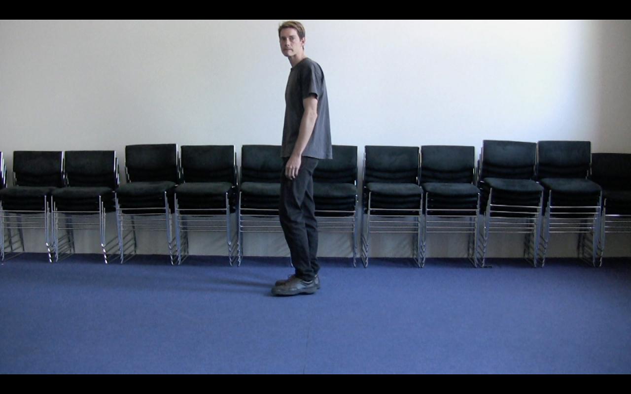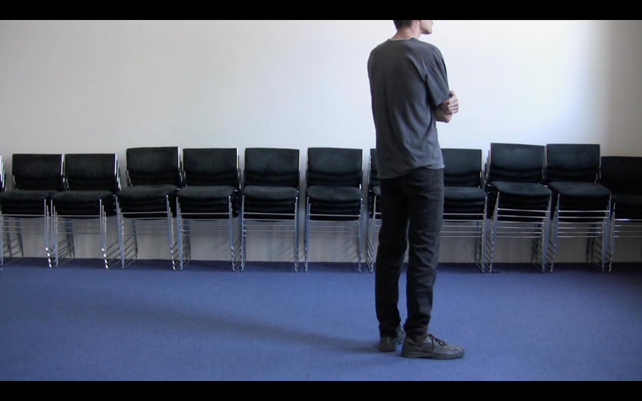 The room in which the filming took place had its own standard monitor on a high mobile-stand. The monitor was switched on during each recording so that the participants could view themselves in the live sense as they moved through the space. The room was equipped with a row of stacked chairs at the rear of the shot. The chairs were not ‘used’ by the participants per se, as this was not instructed and so their non-use became a norm throughout. The male participants were provided with six instructions.