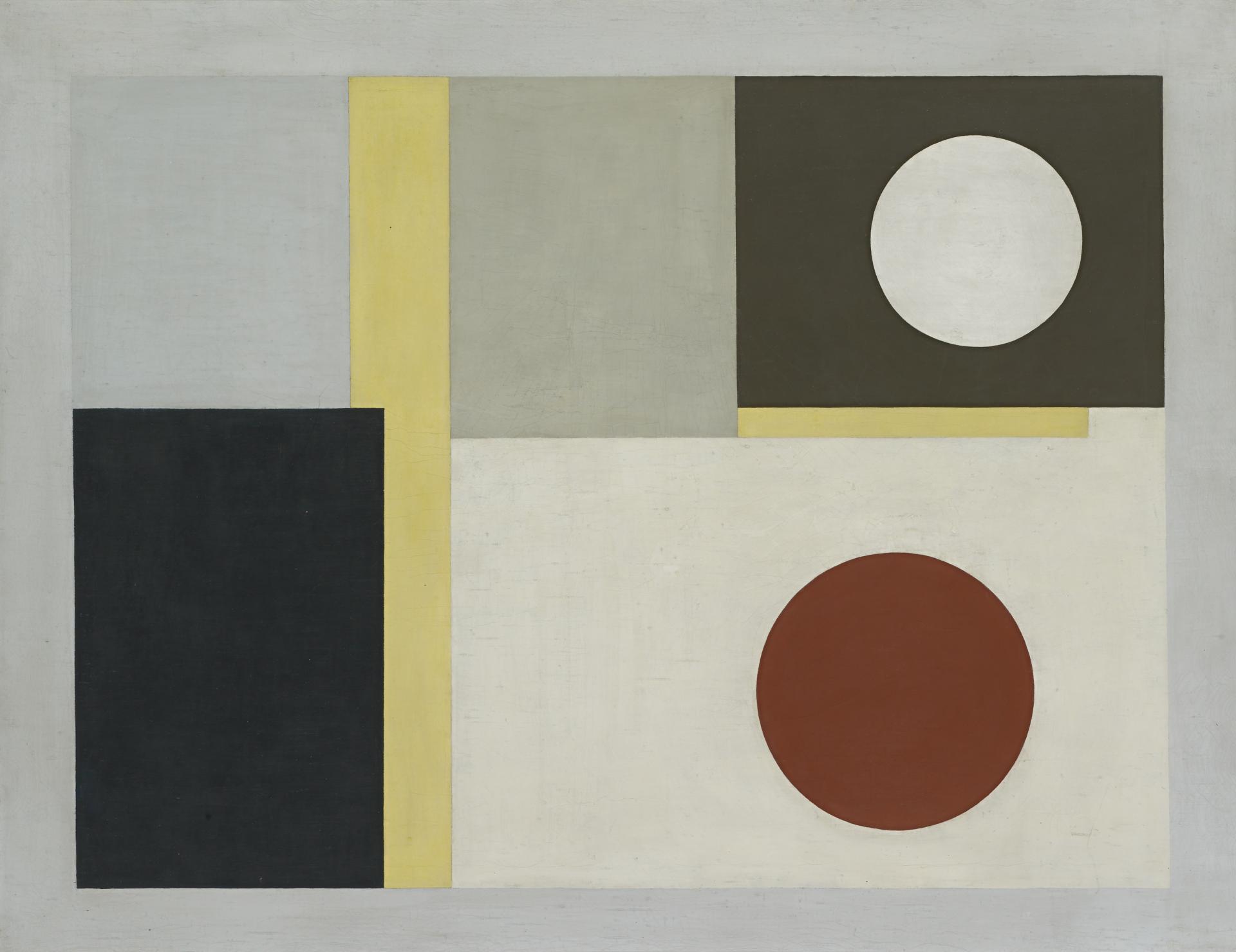 Ben Nicholson is the painter who, more than anyone else, brought progressive English artists during the early 1930s into direct dialogue with their counterparts in Europe, working at the forefront of the European abstraction movement. The son of a distinguished Edwardian painter of portrait and still lifes, Nicholson inherited his father’s love of beautiful objects arranged on tabletops, but the discovery of Cubism and Christian Science, which he encountered in 1918, enabled him to break from the materialism of his father’s tonal realist depictions and to explore the spiritual and universal essence of these same objects through the symbolic language of geometric abstraction.1For a recent examination of Nicholson’s religious belief in the illusory nature of the material world, see Lucy Kent ‘Immortal mind: Christian Science and Ben Nicholson’s work of the 1930s’, Burlington Magazine, Jul. 2015, pp. 474–81. From this point on he restricted himself to using only circles, squares and rectangles and simplified his palette, briefly eliminating colour altogether. 1938, a painting made two decades later, marks the apogee of his shift from the figurative.2For a more detailed account of the evolution and reception of Nicholson’s 1938, see Sophie Matthiesson, ‘Raising the flag of modernism: Ben Nicholson’s 1938’, in Judith Ryan (ed.), Art Bulletin of Victoria, vol. 48, 2008, pp. 6–21. A strangely weightless arrangement of circles tethered within a matrix of overlapping rectangles, the composition offers at most an idea or distant memory of objects distributed on a surface.