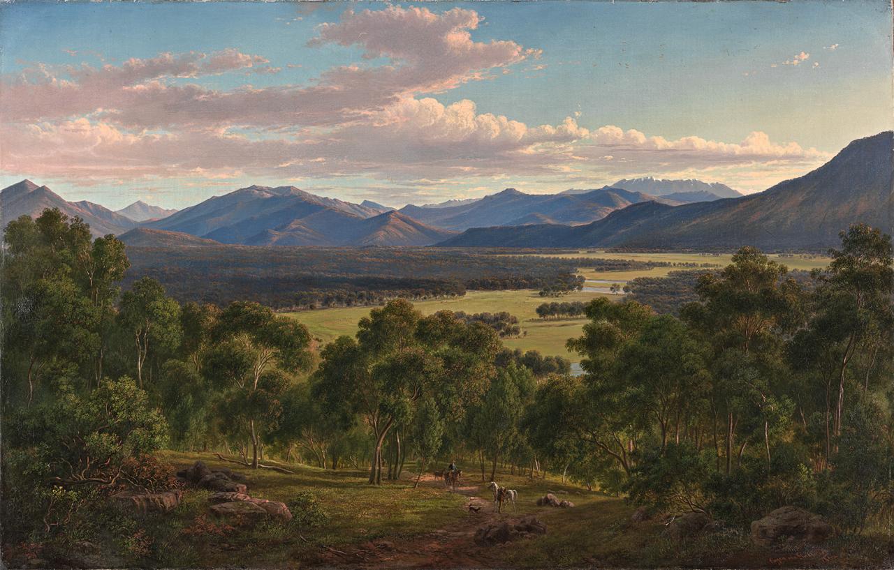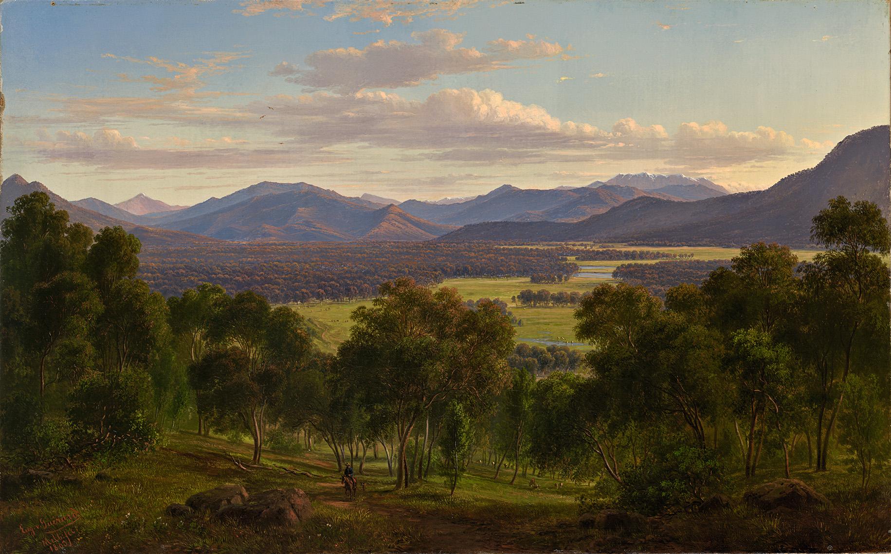 His training and ability as a draftsman was suited to expeditionary documentation and he began participating in scientific excursions initiated for both colonial progress and scientific endeavour. In 1862 he accompanied Professor Georg Neumayer on his magnetic observations of remote north-eastern Victoria; work that followed in Humboldt’s footsteps and received his support.12 The party was the first to ascend Mount Kosciusko, celebrating Von Guérard’s fiftieth birthday on the summit before a storm forced their retreat, causing the loss of one member of the party for thirteen days. Both scientists would have anticipated the ecological significance of the area through descriptions of the eminent government botanist Baron Ferdinand von Mueller who first visited in 1854 and collected numerous previously unknown species.13 See ‘The government botanist’s report of his journey from Melbourne to Omeo in the Australian Alps, Omeo, 1854’ in possession of present writer. From his own experience, Von Guérard would produce several significant works including Spring in the valley of the Mitta Mitta with the Bogong Ranges in the distance, 1863 (fig. 3), taken from a drawing done on the 10,000-hectare pastoral run of Yabba, located at the foothills of palaeozoic terrain caused by the slippage of the Tawonga fault line.14 See J. Stirling, ‘Physical features of the Australian Alps’, Transactions and Proceedings of the Royal Society of Victoria, no. 18, State Library of Victoria, Melbourne, 1882, pp. 98–110. The suggestion of pastoral opportunity located within the immense grandeur of untouched nature had great colonial appeal and another version was later commissioned by Sir Archibald Michie for the NGV collection. This second, larger canvas, Spring in the valley of the Mitta Mitta with the Bogong Ranges, 1866 (fig. 4), was the first painting by the artist to enter a public collection and signalled a critical highpoint in his career, marked by this response from the critic James Smith:
