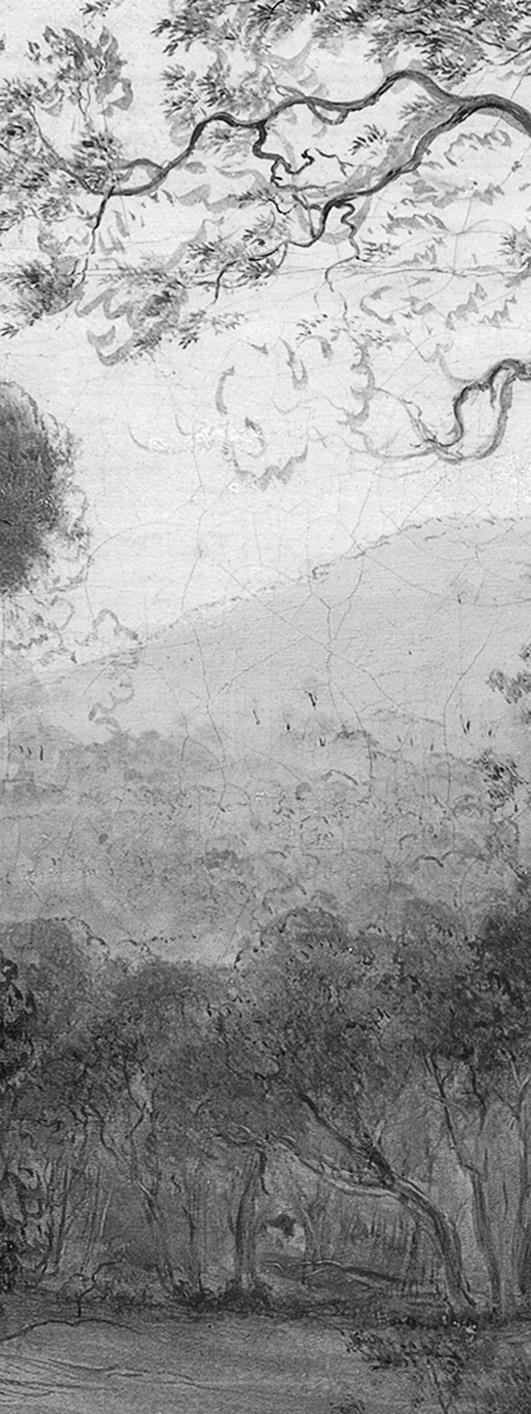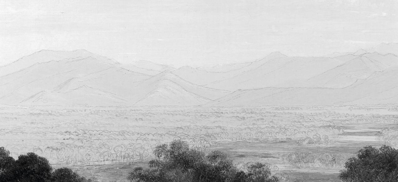 Abandoning brushed ink for the accuracy of pencil line, Von Guérard transferred the original drawing to canvas with scientific precision. Using delicate outlines, he contoured the distant ranges; drew the singular trees of the intermontane plateau and, in a looser hand, delineated the vegetation (fig. 5). The foregrounds of these two paintings were adjusted to ensure a pictorial harmony stipulated by the changes in scale, but continue to represent local species and an attempt to preserve the individual character of trees observed on location.