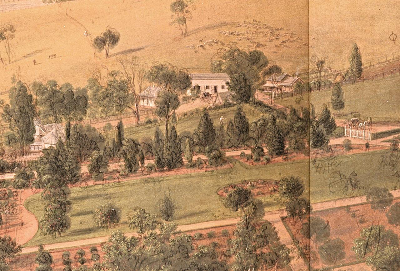 Von Guérard’s available vantage point was the neighbouring escarpment accessible by the bridge seen at the bottom of the painting. Mount Macedon emerges from the outstretched horizon below an allocation of sky based on the golden section. Depicted on the lawn in the original drawing is Walter Clark, his wife Annie and two of their children, while another child and two figures adorn the veranda. Tragically, the pregnant Annie Clark died four months later, following childbirth and, consequently, is not shown in the final painting.20 Annie Clark died in October 1865 (Victorian Probate Index 1841–1992 GMF99, box 1, fische 5). Six years later Walter Clark died from a buggy accident caused by his wrong mounting of the harness that resulted in the horse being overrun by the buggy on the steep decline. (VPRS 24/P0000/288).