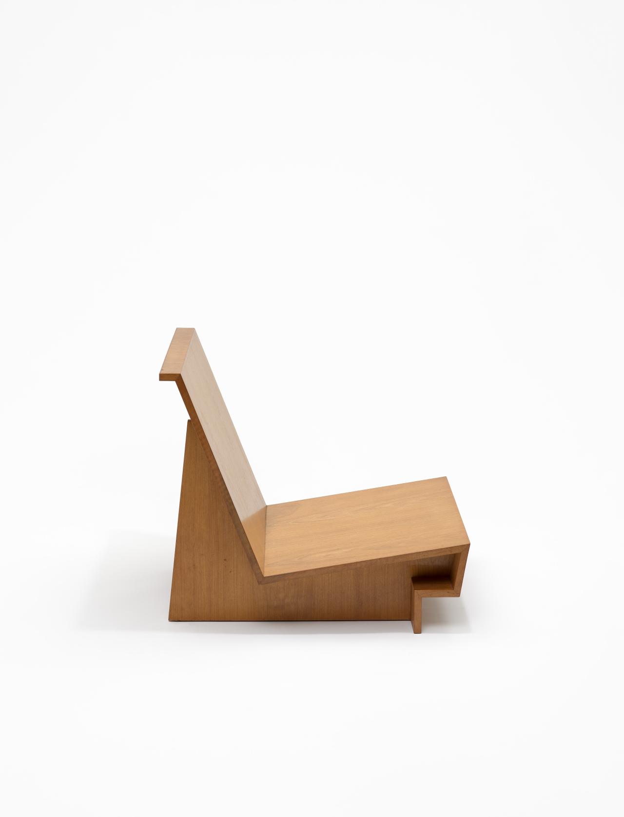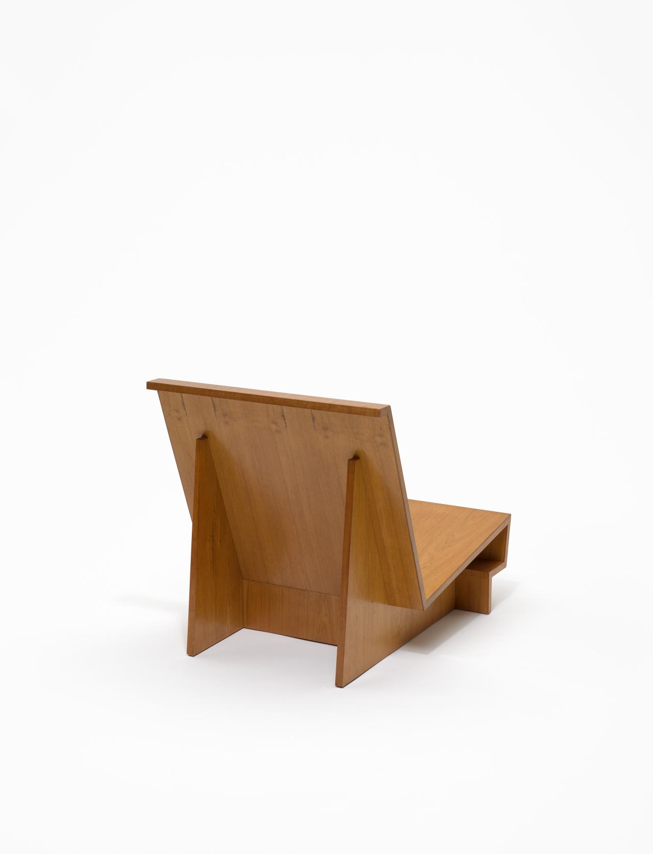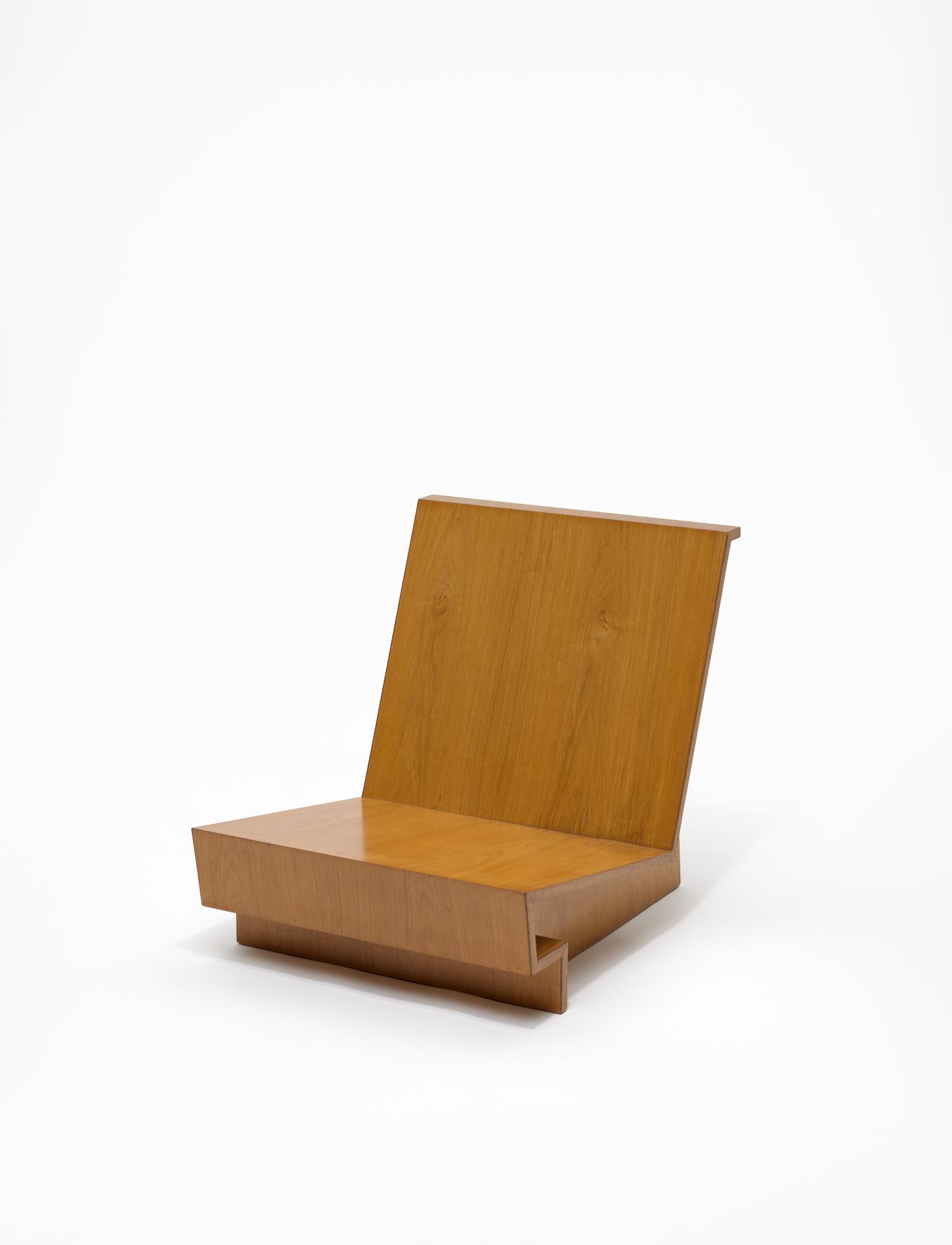 There were few internal walls in Usonian houses and much of the furniture, cabinetry and bookshelves were built in to save space. Despite the low-cost approach, Wright still designed all the furniture for his Usonian houses, each concept unique. Chairs and tables were based on geometric forms including the triangle, cube and parallelogram, and pieces were easily constructed through interlocking modular elements with simple upholstered cushions. The NGV recently acquired a pair of chairs thanks to the generous support of Krystyna Campbell-Pretty AM and Family. The large, low pair of chairs dates to the late 1930s and are typically Usonian, with their flat angled planes and triangular supporting elements. For cost efficiency, the chairs were made from cypress plywood with a chipboard core. They would have originally had simple walled cushions for the seat and back with textile panels that hung over the front and back ledge. While Wright’s Usonian houses were modest in scale, his freestanding pieces of furniture were capacious and reflect his desire for his houses to be comfortable spaces for living.