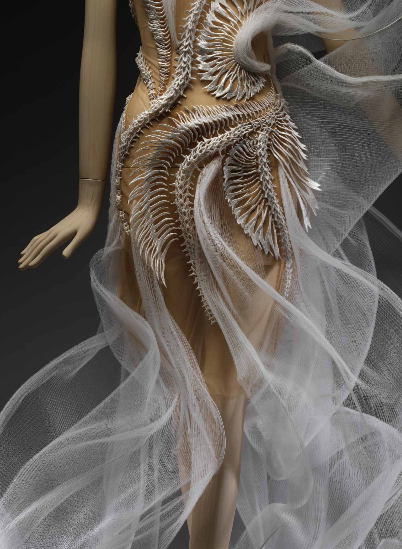 This is not the only design that finds its inspiration in a natural phenomenon. In many of her designs van Herpen uses pioneering technologies to represent immaterial processes like dreams, soundwaves, wisps of smoke, magnetic fields or splashes of water. She admires complex organic forms like spider webs, butterfly wings, shells and skeletons. In an interview she explains why: ‘With 3D printing, I am very much drawn to the organic … because in organic structures such as fossils, for instance, you have structures that you can’t easily replicate by hand.’11Iris van Herpen, quoted in Andrew Bolton, Manus x Machina: Fashion in an Age of Technology, The Metropolitan Museum of Art, New York, 2016, p. xvii (in the supplement to the catalogue). The technique of digital designing allows her to create in three dimensions sophisticated forms that are impossible to design using a 2D drawing or even by moulding on a dummy.