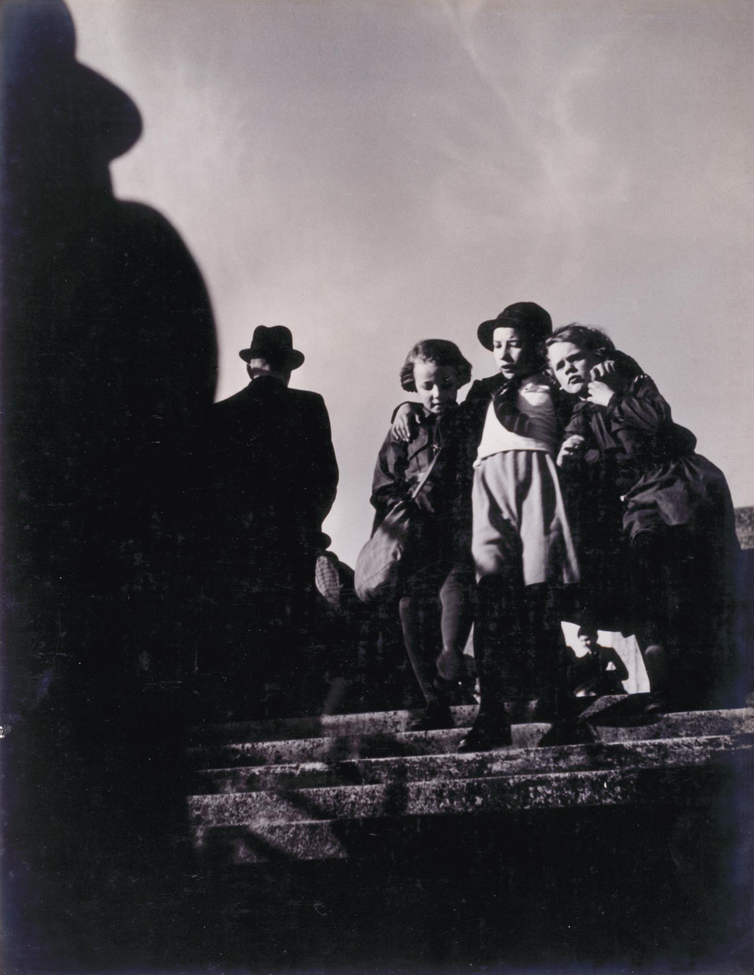 London zoo 1935 (fig. 2) is one of the most striking images from this period. It is an upward-angled shot of three children on a flight of steps. A sense of drama, even menace, is conveyed by two anonymous figures whose dark forms seen from behind are moving towards the children. The bold cropping of one of these figures and the use of strongly contrasting tones make this a powerful photograph.