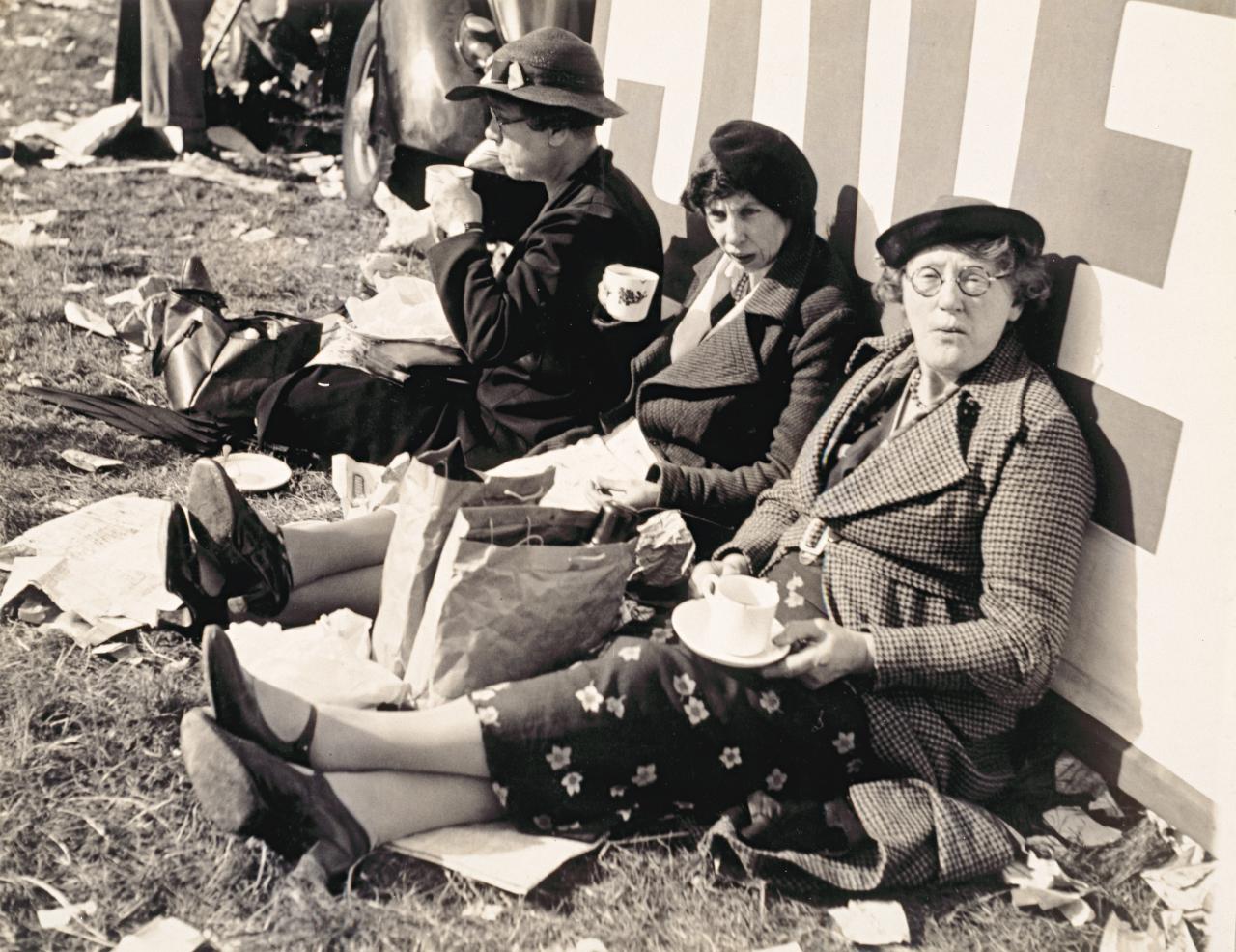 In a wittier vein Collings photographed one of Britain’s great customs – that of tea-drinking – in English Derby 1936 (fig. 5). The three ladies maintain a certain formality with cup and saucer in hand despite their circumstances. The cluttered nature of the area that surrounds them is visually relieved by the white sign they lean against.